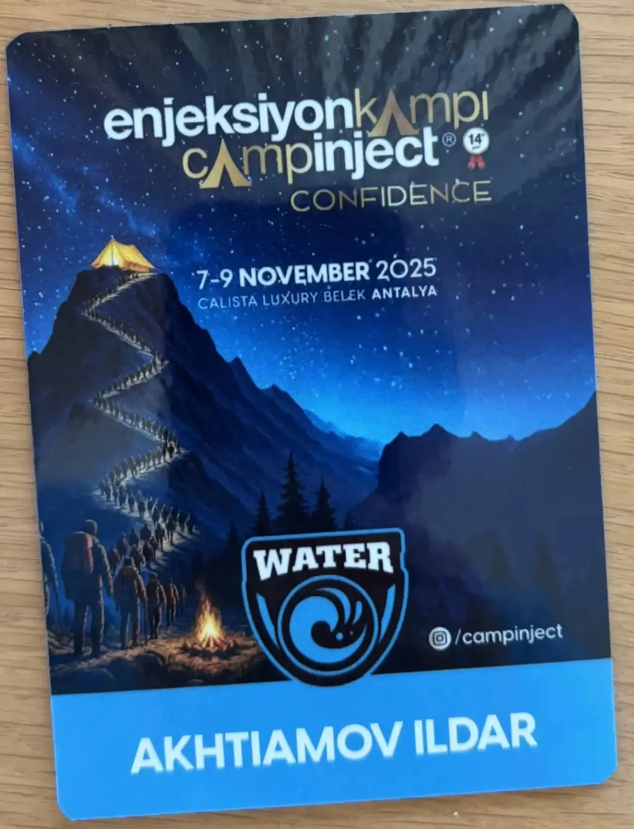 На фото запечатлен заведующий кафедрой травматологии, Ахтяямлов Ильдар Фоатович, с именным бейджиком среди коллег на фоне фирменной фотозоны CampInject с символикой Water и горными пейзажами. Групповой снимок на красной ковровой дорожке подчеркивает командный дух и 15-летие организатора. Это посещение укрепило профессиональные связи и позволило внедрить передовые практики в клиническую работу.