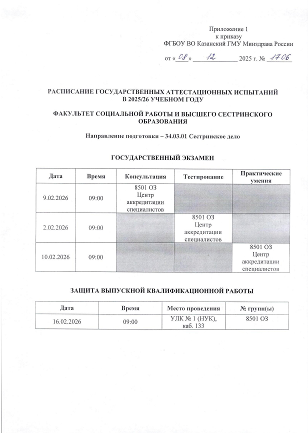РАСПИСАНИЕ ГОСУДАРСТВЕННЫХ АТТЕСТАЦИОННЫХ ИСПЫТАНИЙ В 2025/26 УЧЕБНОМ ГОДУ. Направление подготовки Сестринское дело, очно-заочное отделение