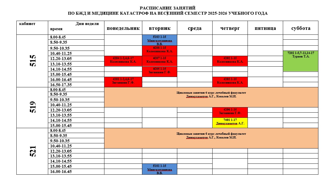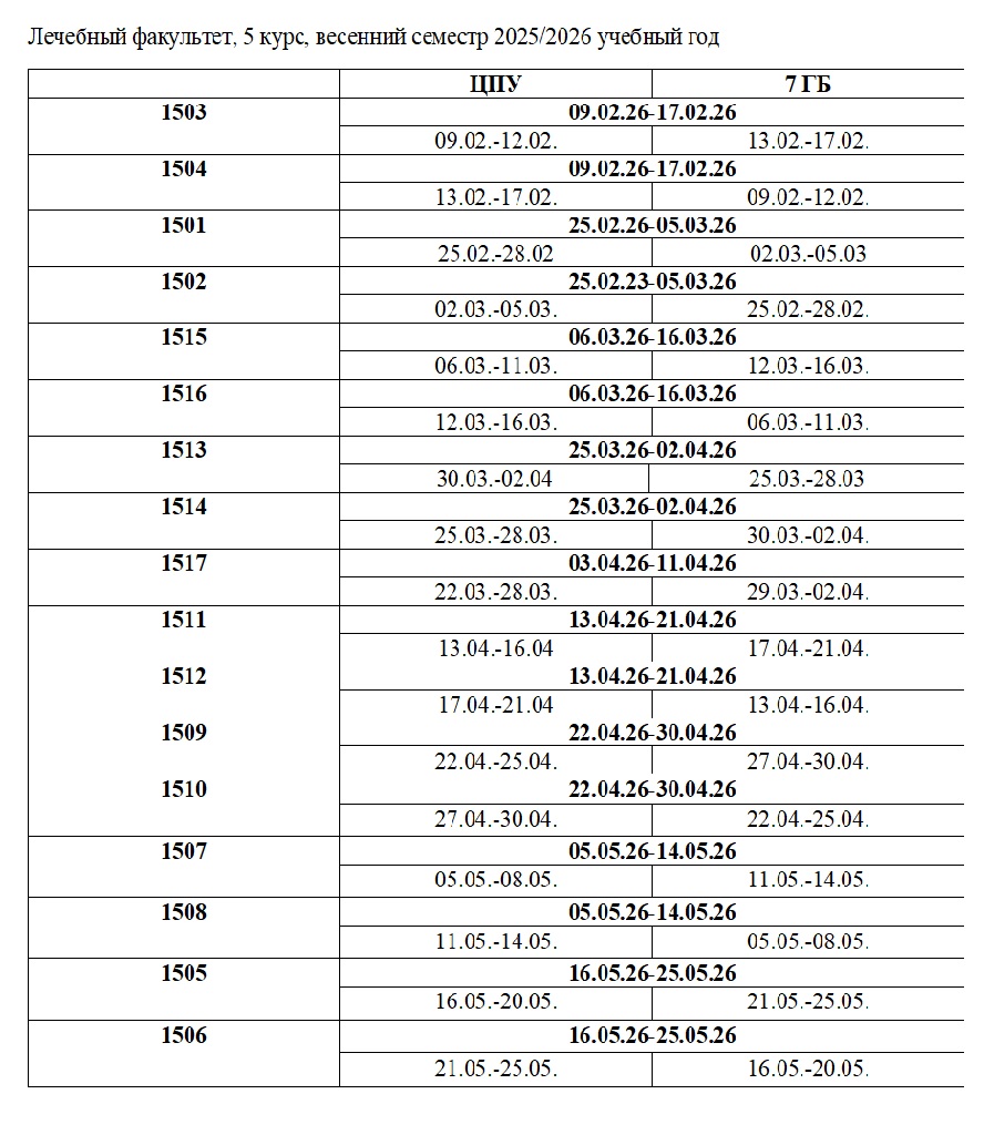 Расписание практических занятий Лечебный факультет, 5 курс, весенний семестр 2025/2026 учебный год