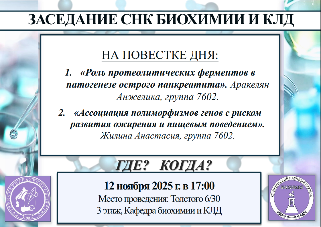 Список студентов-участников СНК на 2022/23 учебный годПлан работы студенческого научного кружка кафедры биохимии и КЛД на 2021/22 учебный год скачать файл