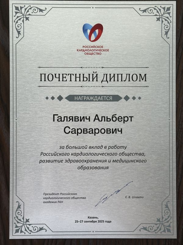 Профессор А.С. Галявич переизбран вице-президентом Российского кардиологического общества.