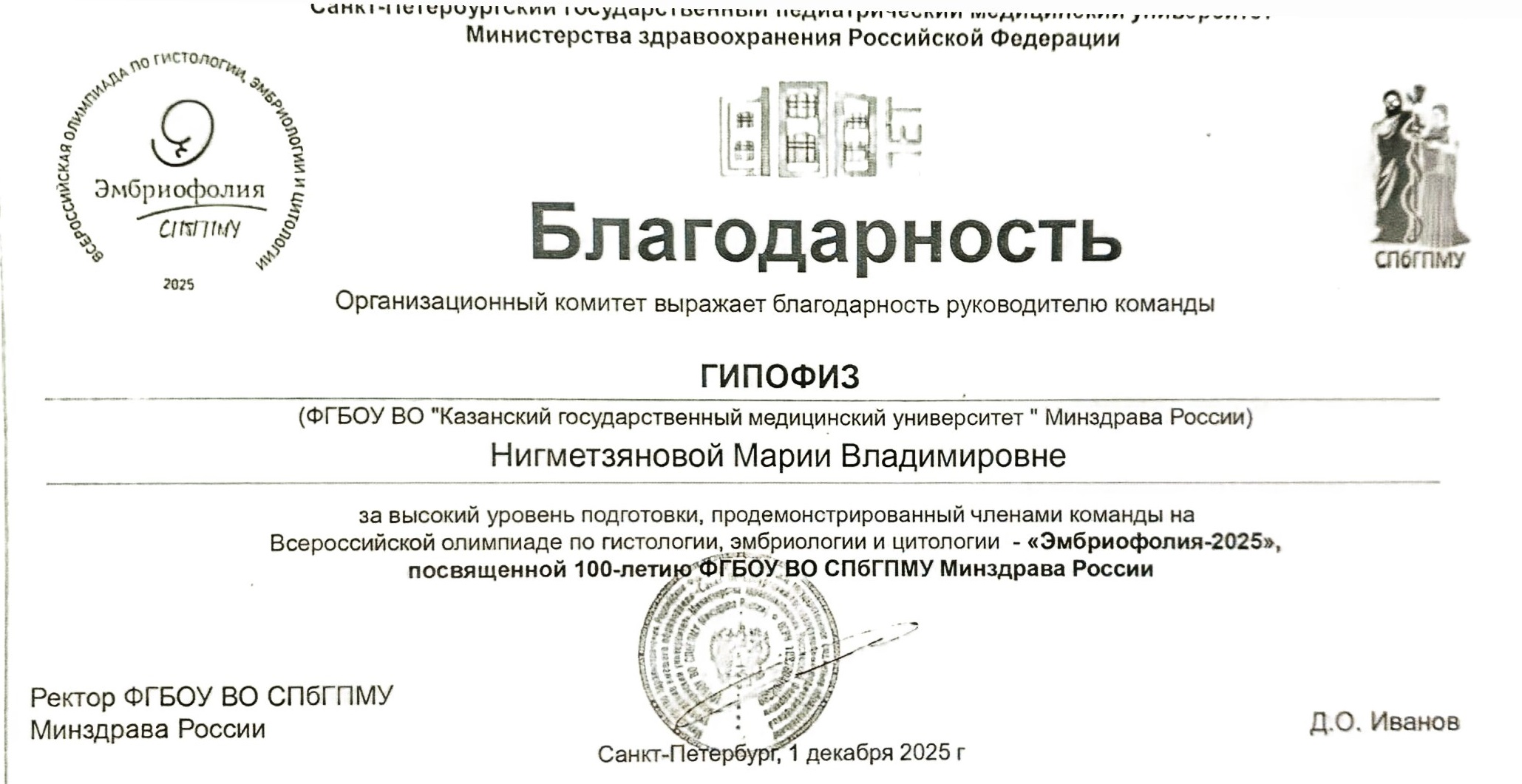 Доцент кафедры Мария Владимировна Нигметзянова получила благодарность за высокий уровень подготовки, который показала команда студентов «Гипофиз» на Всероссийской олимпиаде по гистологии, эмбриологии и цитологии «Эмбриофолия-2025». Олимпиада проходила 1-2 декабря в Санктпетербуржском государственном педиатрическом медицинском университете.