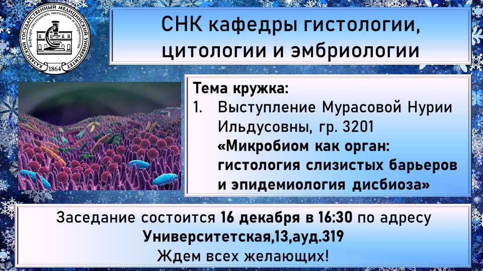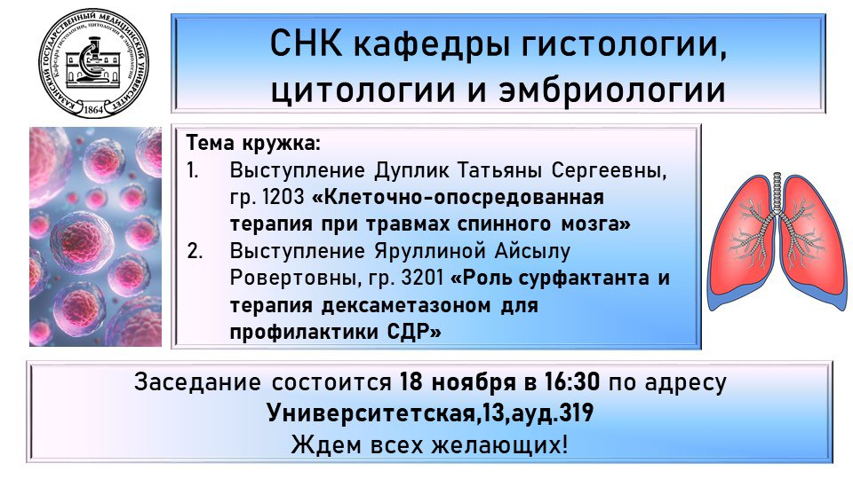 СНК кафедры гистологии приглашает первокурсников к участию в научных исследованиях кафедры гистологии. Заседание состоится 18 февраля 2025 года в 17.00. Тема заседания: Доклад Шарафутдинова И.Р. (гр. 1301) «Стволовые клетки пуповинной крови: опыт и перспективы использования в неврологической практике». наш адрес: ул. Университетская, 13, ауд. 319