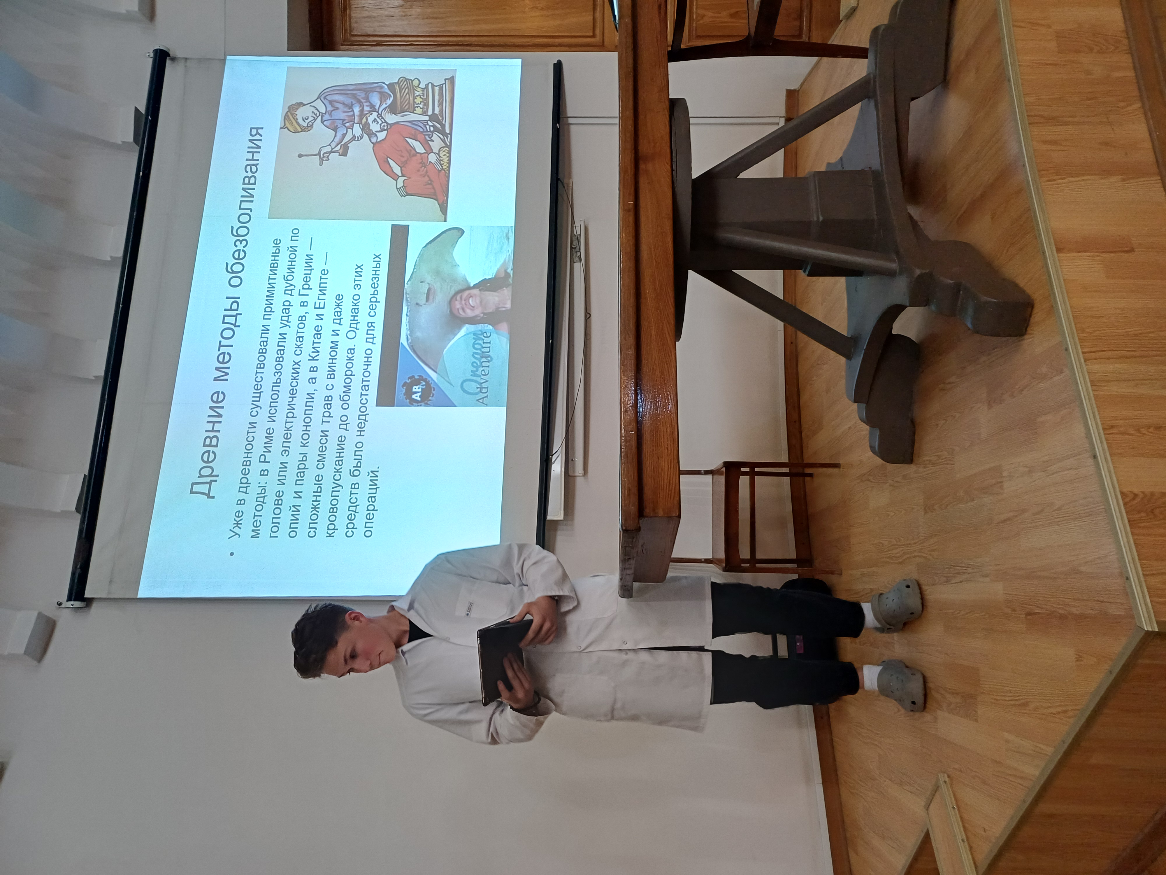 Реджепов Эмир рассказал о открытии анальгетиков, после Гиззатулина Эллита осветила тему антибиотиков, в завершении Мелехин Артем доложил об открытии анестетиков.
