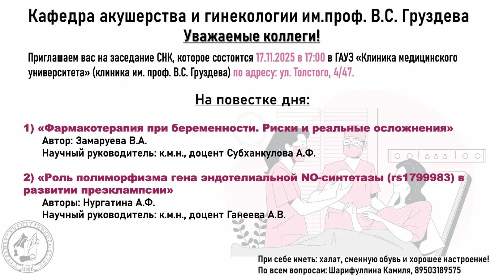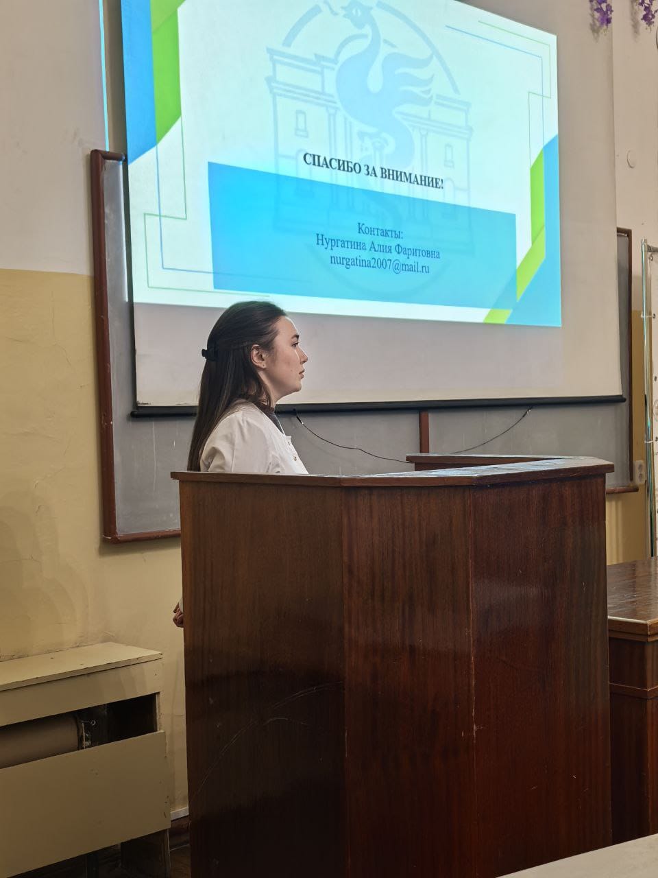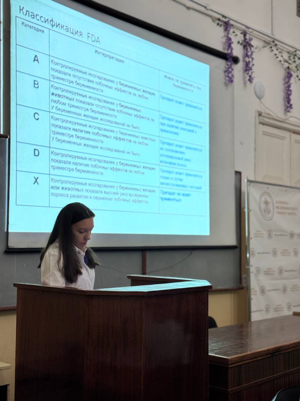 С докладом на тему «Фармакотерапия при беременности. Риски и реальные осложнения» выступила Замураева Виктория. В своем выступлении она осветила влияние различных групп лекарственных препаратов на здоровье беременной женщины и на процессы формирования органов и систем плода в критические периоды эмбриогенеза. Были рассмотрены как потенциально опасные тератогенные средства, так и препараты, применение которых считается относительно безопасным, с указанием возможных рисков и преимуществ. Асия Фаридовна прокомментировала доклад, отметив, что на практике препараты зачастую назначаются без достаточного учета индивидуального состояния пациентки.