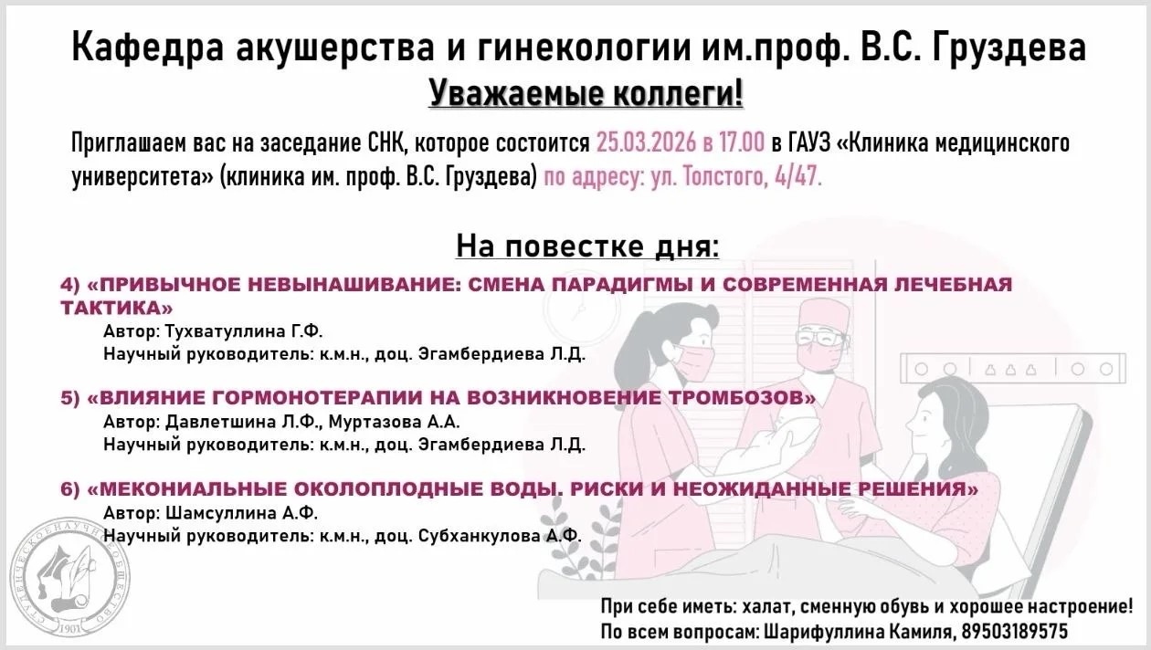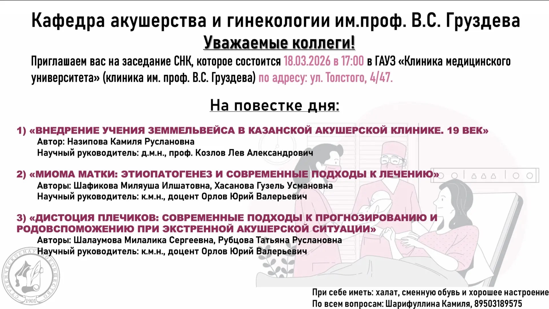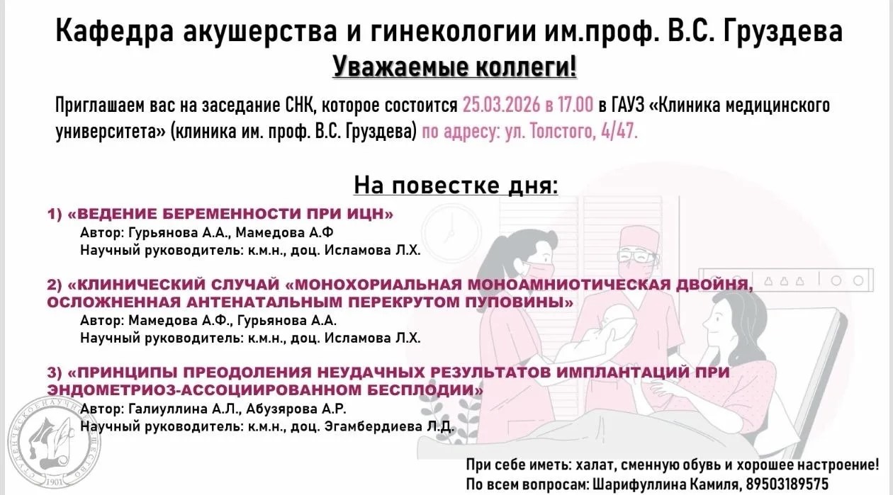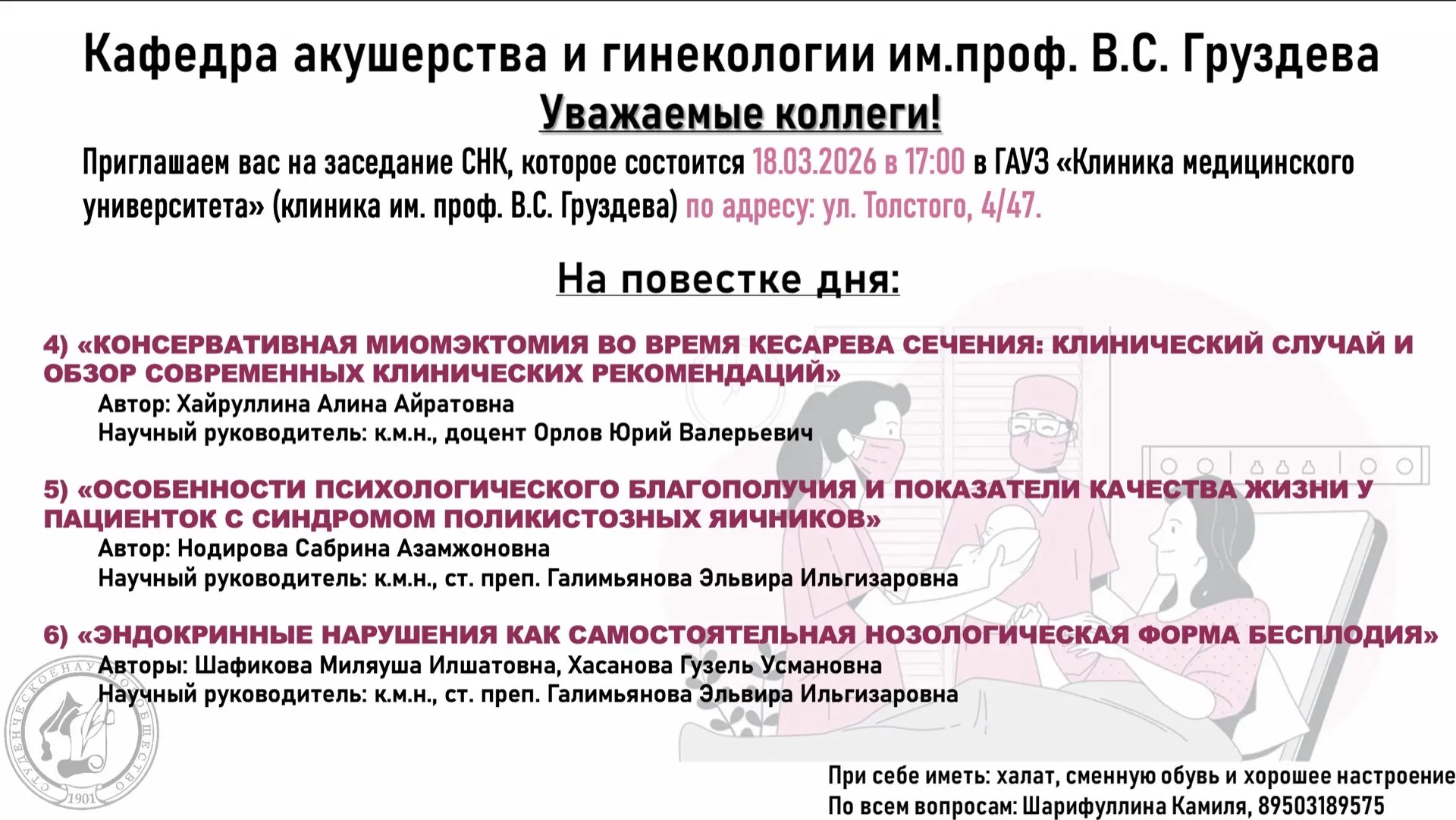 18 марта 2026 года прошло очередное заседание студенческого научного кружка кафедры акушерства и гинекологии имени проф. В.С. Груздева. Мероприятие состоялось на базе ГАУЗ «Клиника медицинского университета» (клиника им. проф. В.С. Груздева). На заседании присутствовало 27 студентов.