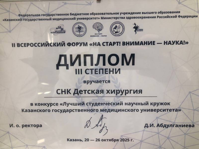 С 20 по 26 октября 2025 г. в Казанском ГМУ прошел II Всероссийский форум «На старт! Внимание – Наука!». СНК нашей кафедры получила диплом III степени в конкурсе "Лучший студенческий научный кружок"