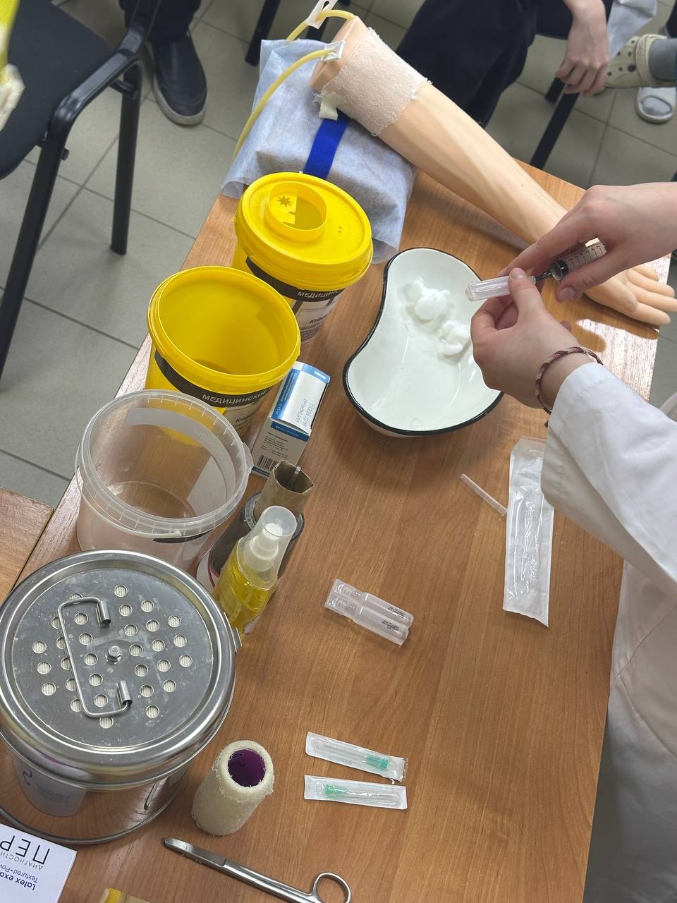 Но самое интересное ждало нас во второй части! Здесь уже все студенты перешли к практике на реальных «пациентах» (то есть друг на друге). Под пристальным и заботливым присмотром Лилии Лукмановны ребята осуществили венозный доступ, а кто-то даже поставил периферический катетер. Это невероятный опыт, который учит не только точности движений, но и внимательному отношению к человеку.