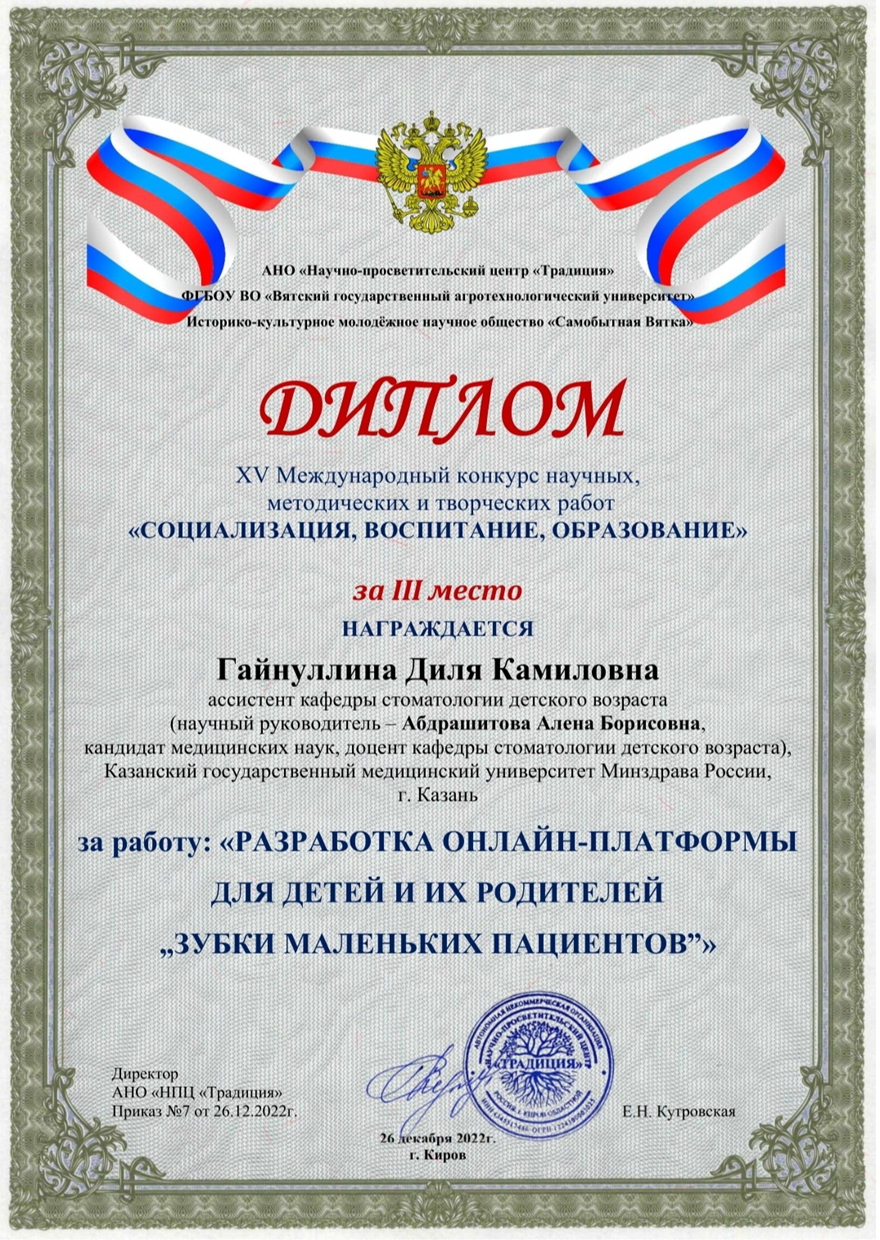 26.12.2022 г. в ФГБОУ ВО «Вятский государственный агротехнологический университет» состоялся XV Международный конкурс научных, методических и творческих работ «СОЦИАЛИЗАЦИЯ, ВОСПИТАНИЕ, ОБРАЗОВАНИЕ», среди большого количества участников из Высших учебных заведений Российской Федерации команда кафедры стоматологии детского возраста: Сафина Р.М., Абдрашитова А.Б., Гайнуллина Д.К., Саматова Р.З. заняла 3 место!