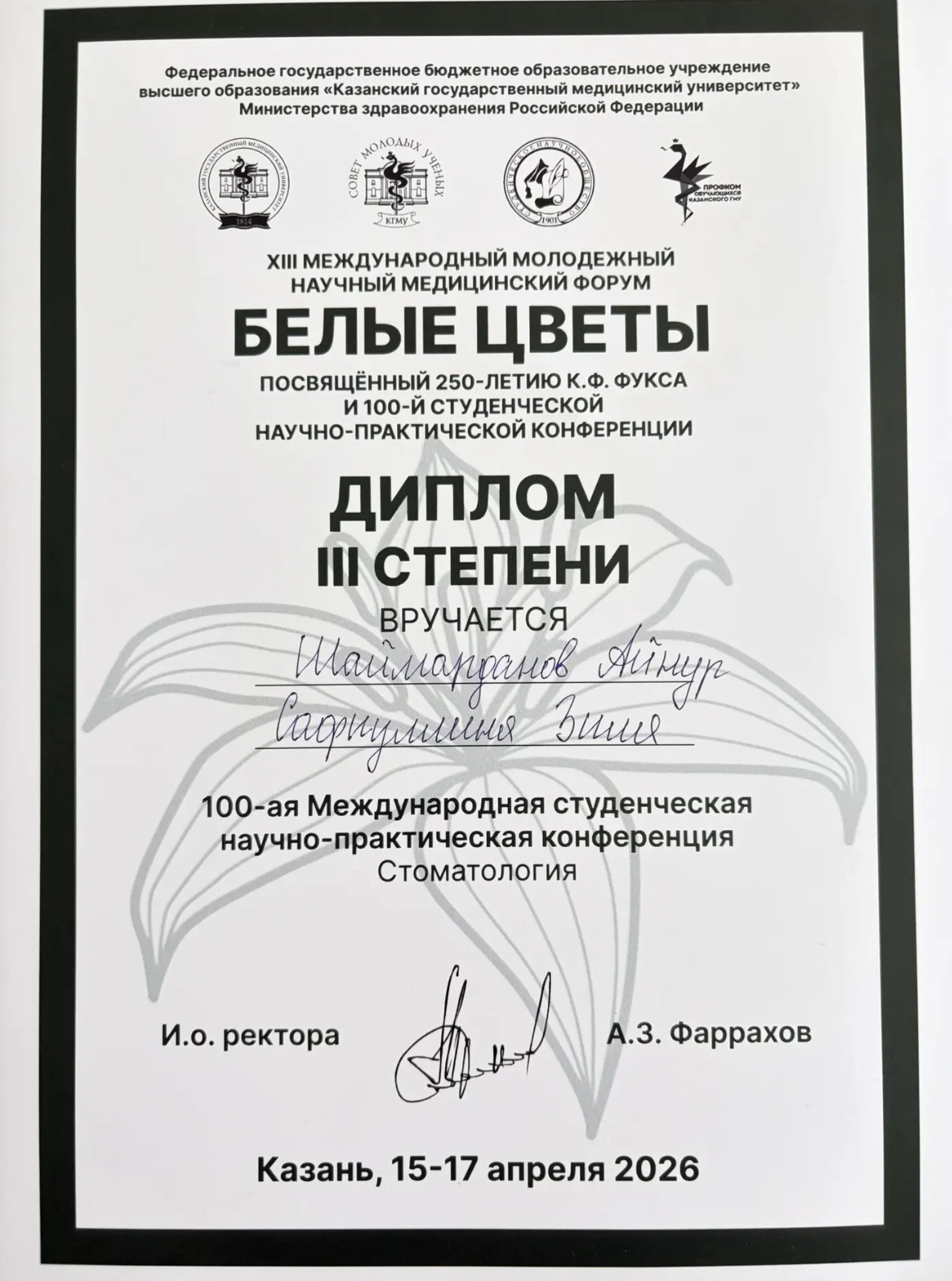 Диплом III степени удостоен доклад «Взаимосвязь между дисфункцией ВНЧС и анатомией латеральной крыловидной мышцы». Докладчики - Шаймарданов А.А., Сафиуллина З.А. студенты группы 4508 (руководитель- к.м.н., ассистент Игнатьева Л.А.) .