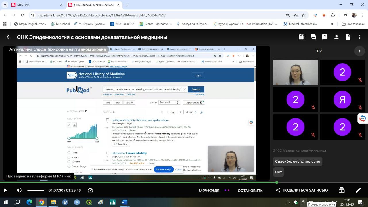- Практическое освоение функционала и стратегий поиска в базах данных: PubMed, Google Scholar, e-Library (демонстрацию провела куратор кружка С.Т. Аглиуллина).