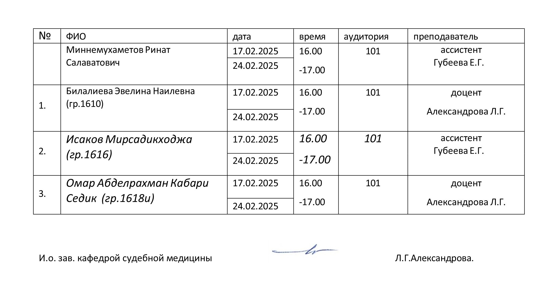 !!! График ликвидации академической задолженности по кафедре судебной медицины в рамках первой повторной промежуточной аттестации студентов (согласно пр. №76/адм от 09.02.2026) !!!