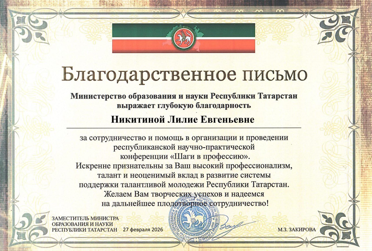 Благодарность Министерства образования и науки Республики Татарстан