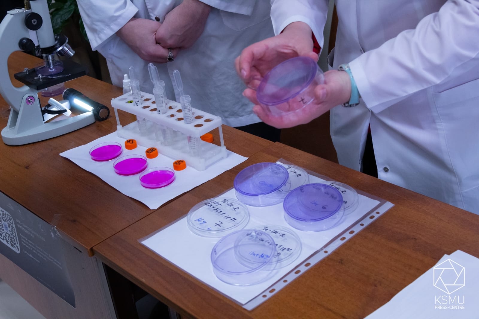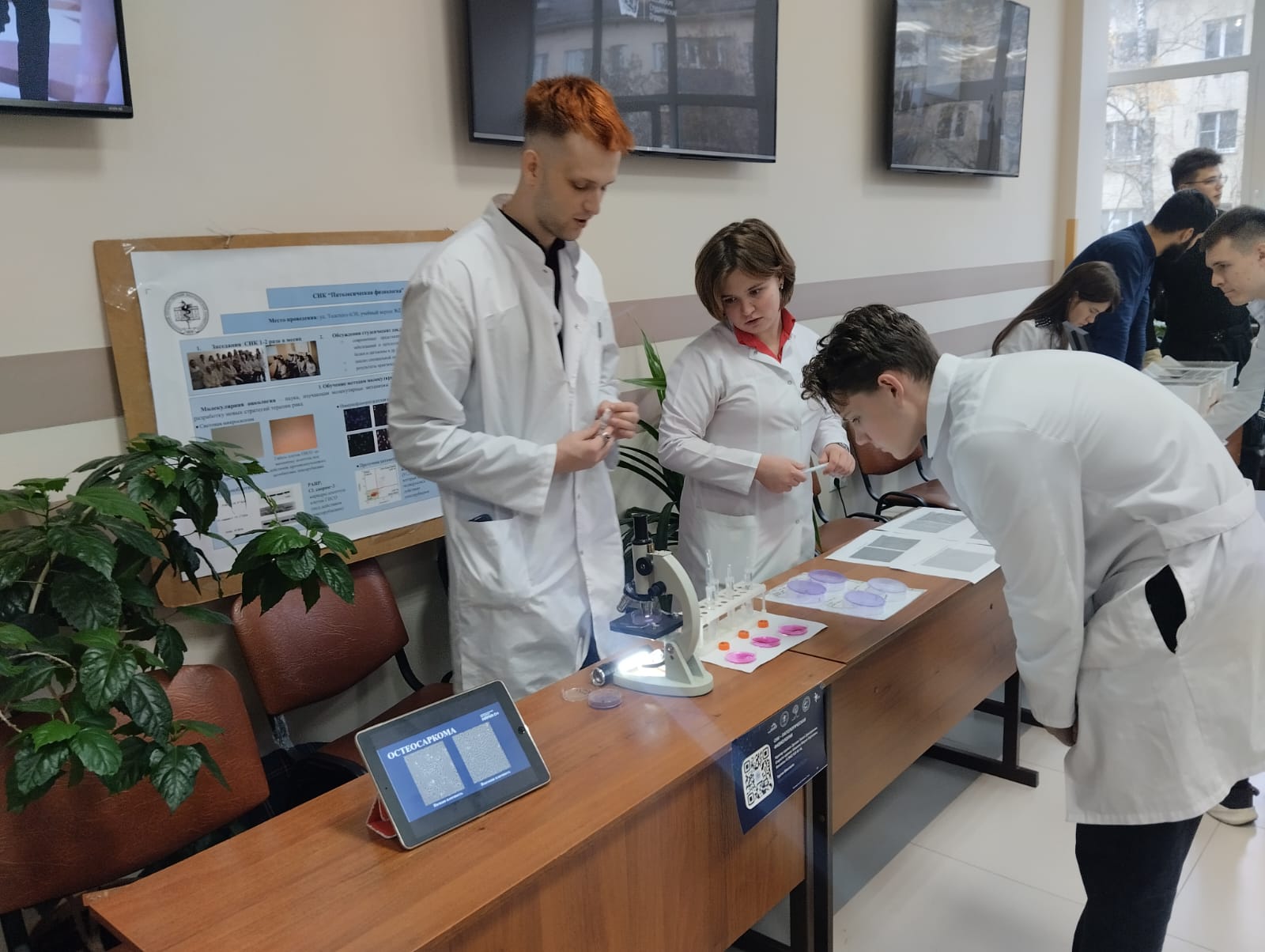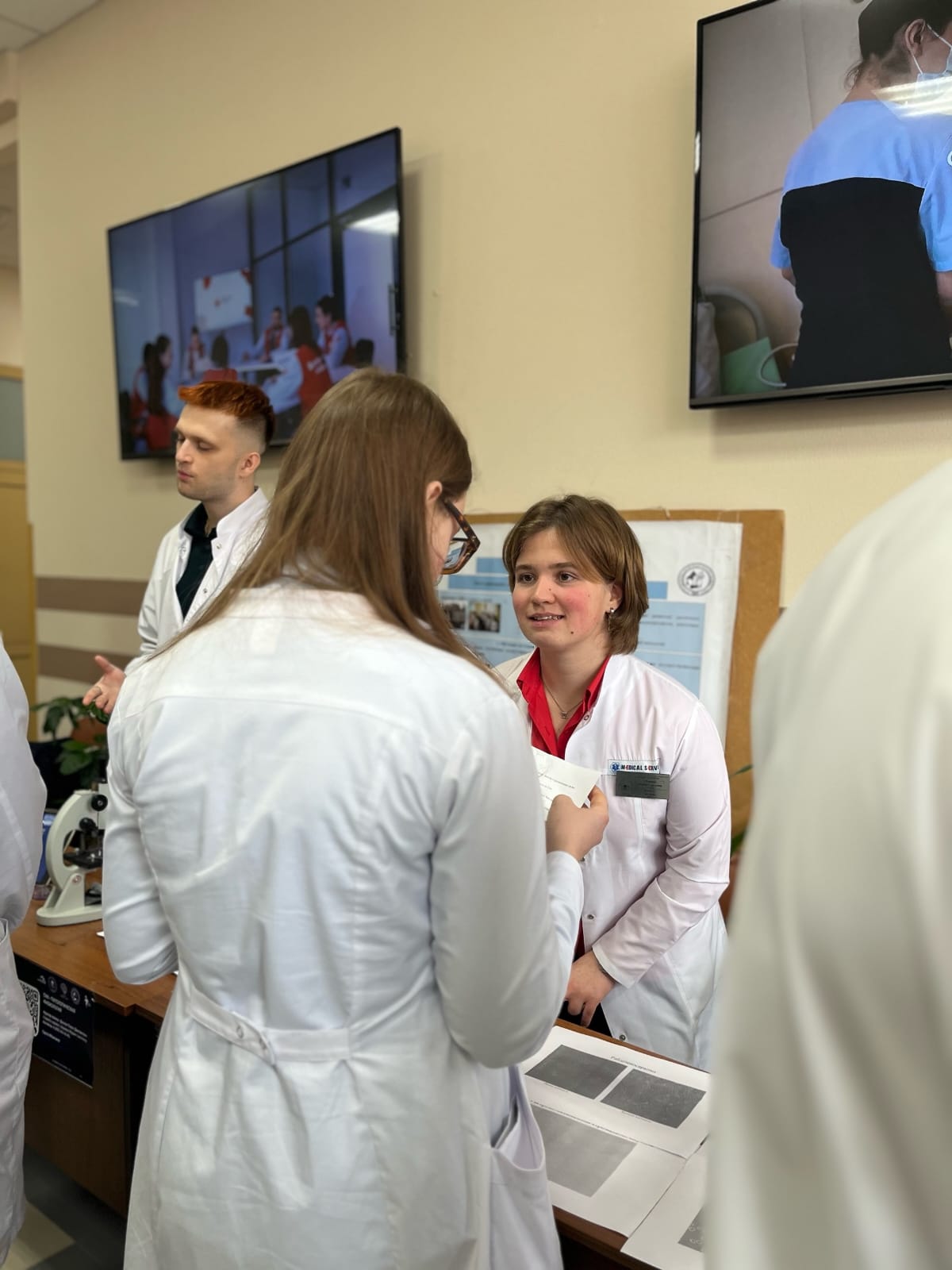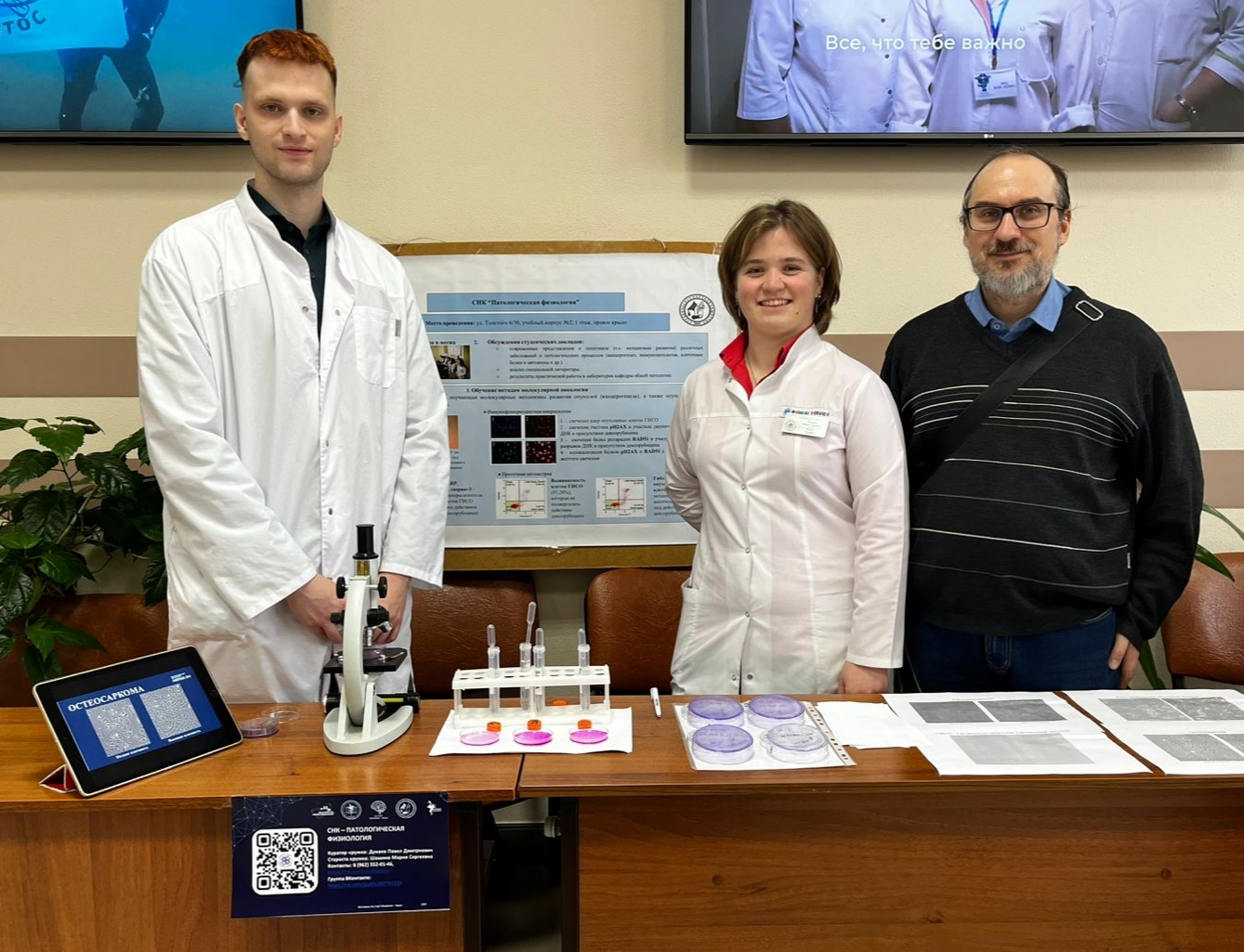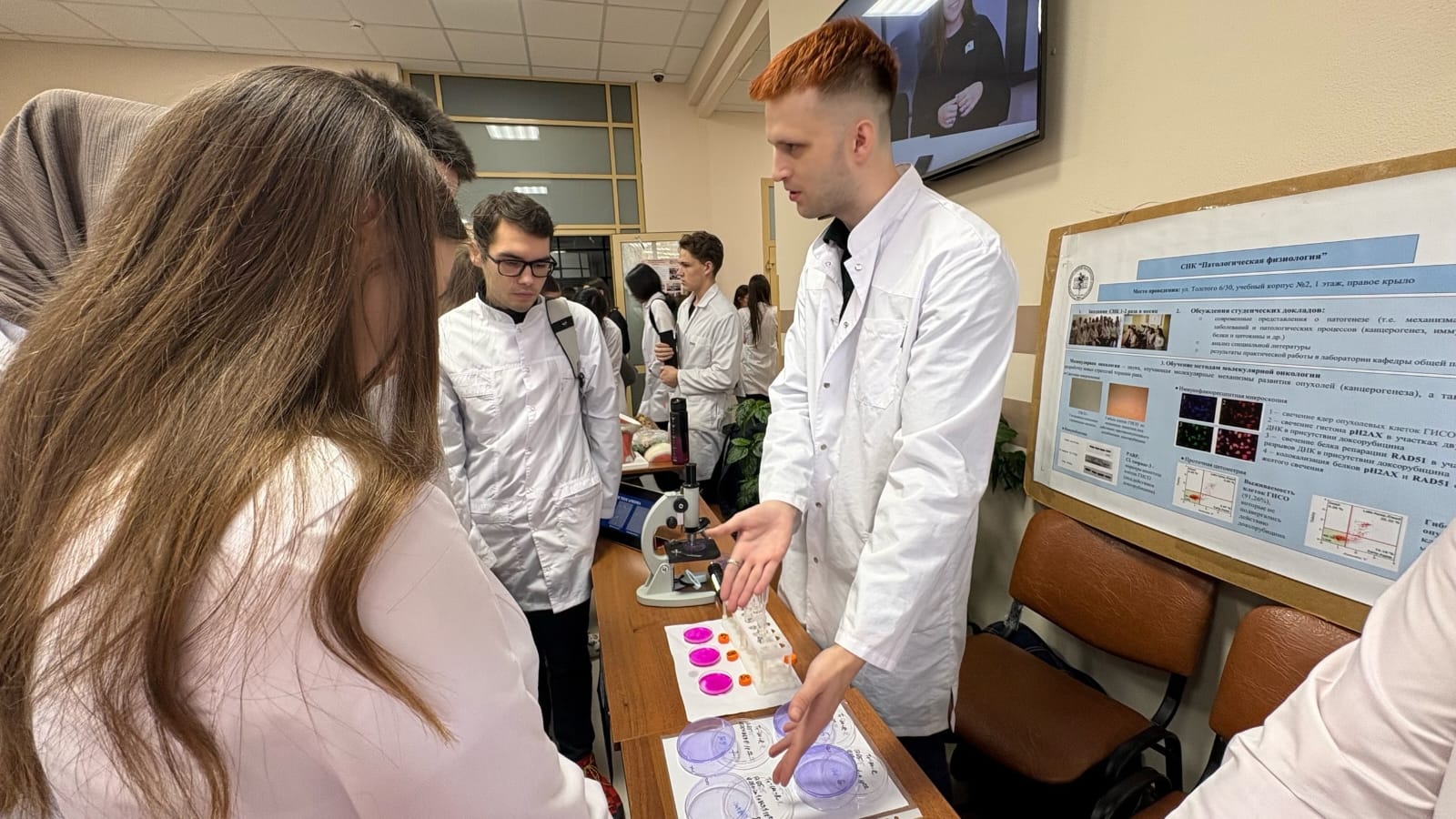 6 апреля 2025г. в КГМУ состоялся «День открытых дверей». Традиционно научные кружки университета знакомили старшеклассников с организацией научно-исследовательской работы на кафедрах. Доклад о студенческом научном кружке «Патологическая физиология» представили Шашина Мария и Караева Ширин (гр. 1514). Они рассказала о научных исследованиях по молекулярной онкологии, которые проводятся на кафедре общей патологии.