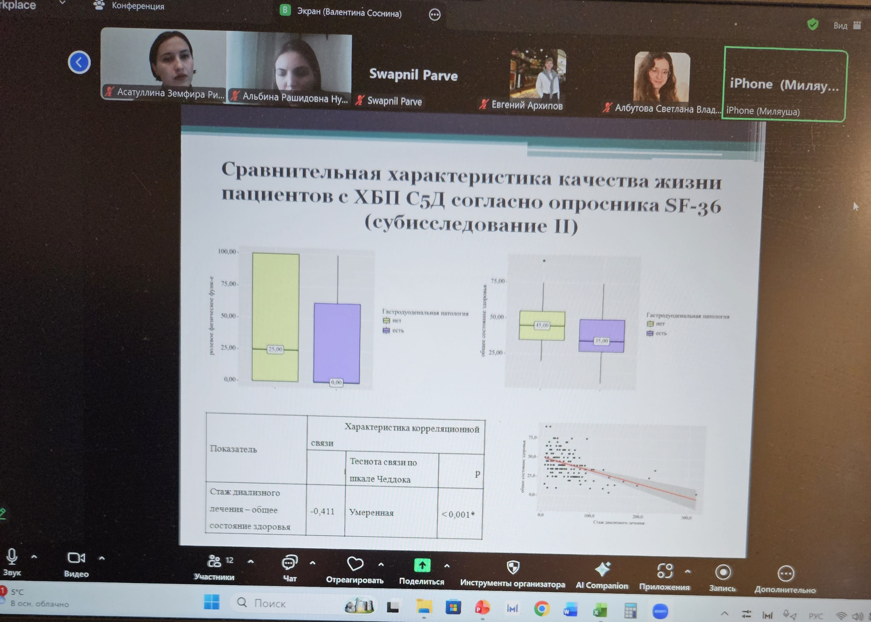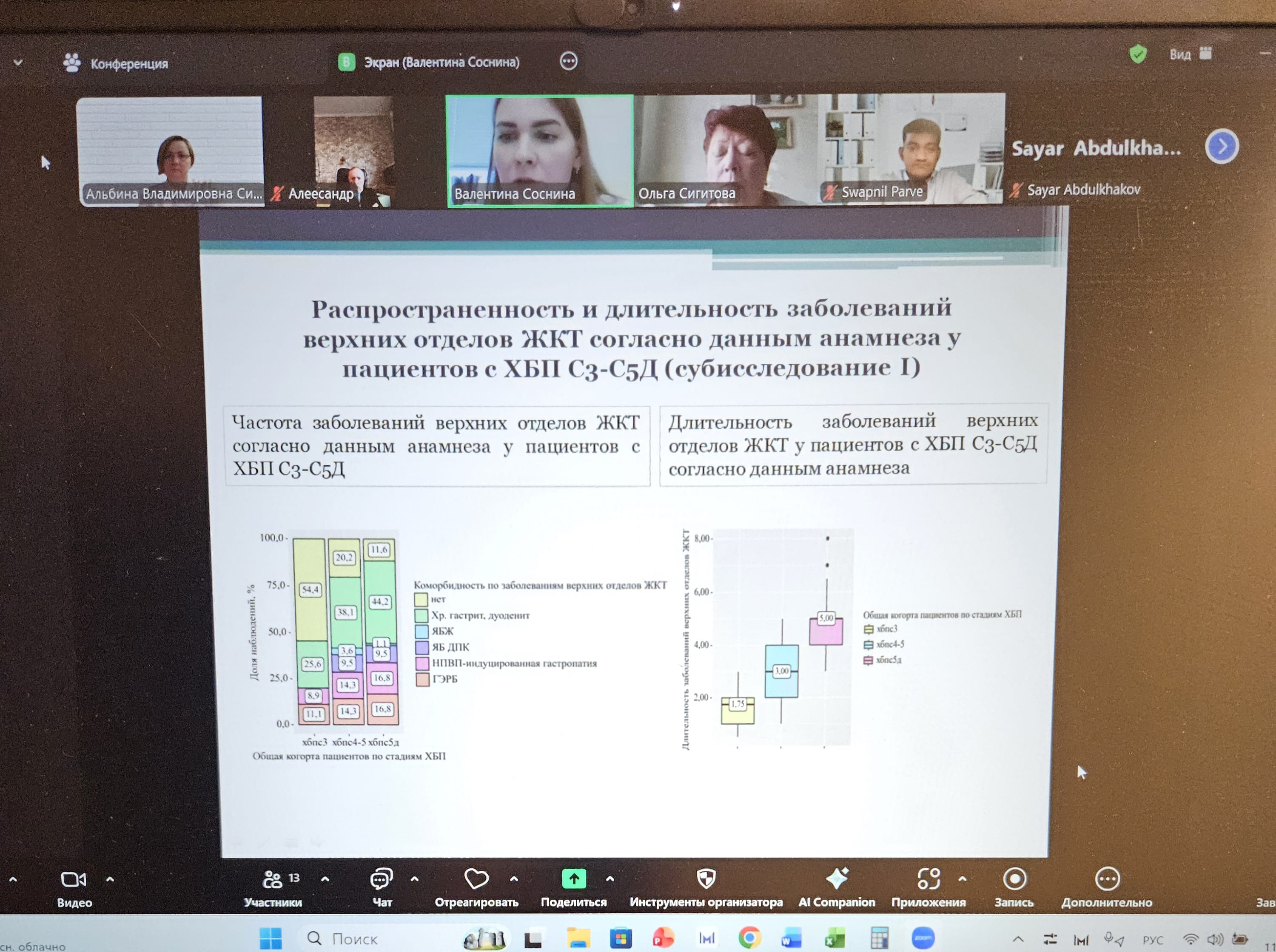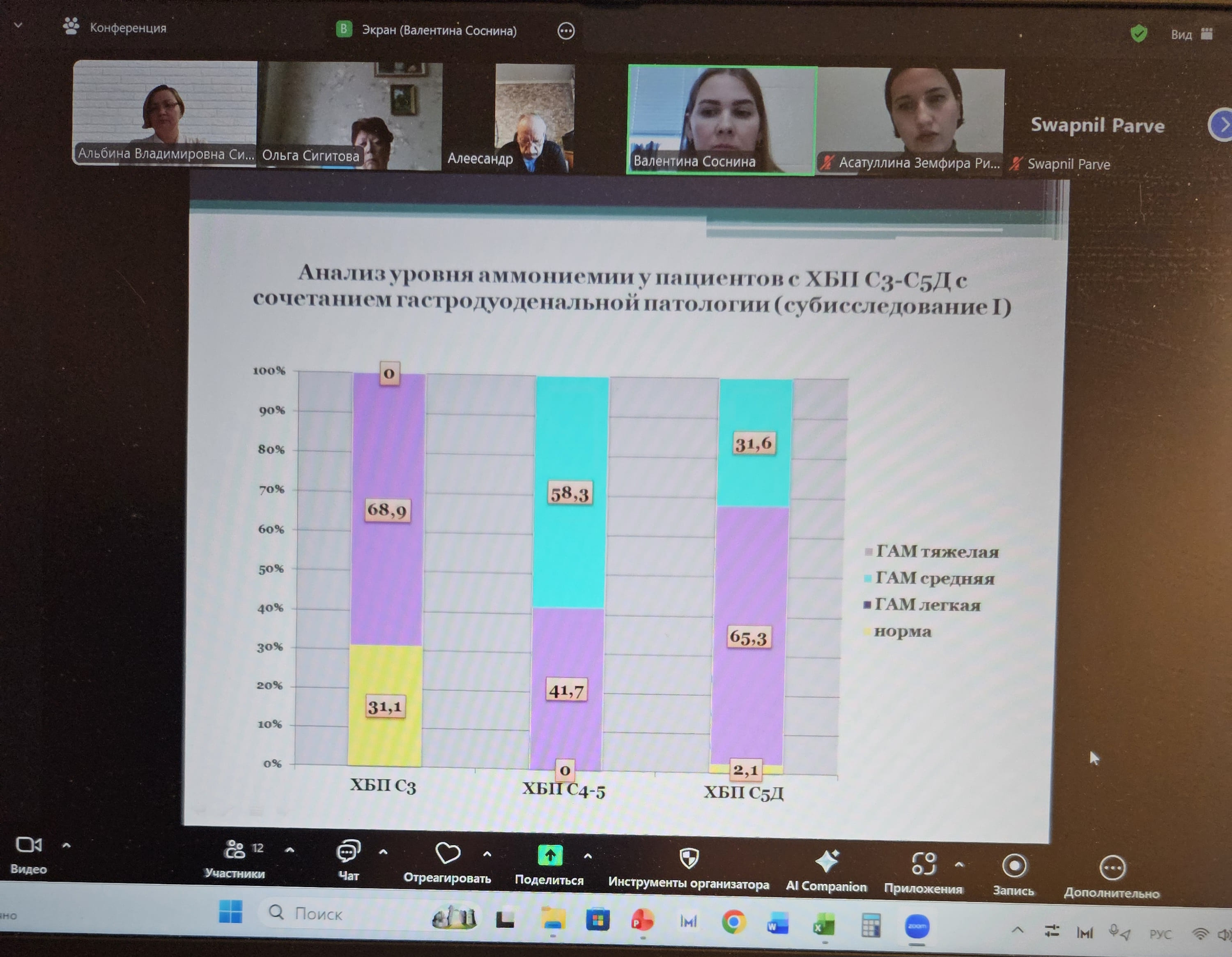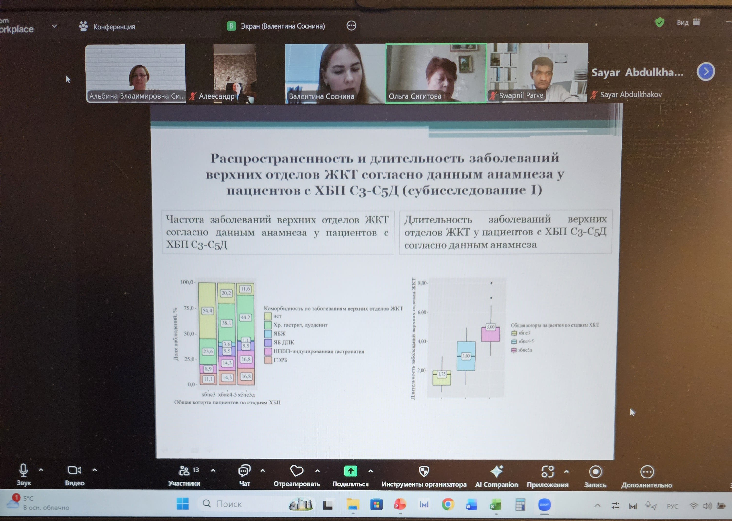 11.11.2025г прошло кафедральное заседание с заслушиванием и обсуждением кандидатской диссертации Сосниной Валентины Сергеевны по теме «Клинико-морфологические особенности гастродуоденальной патологии у пациентов с хронической болезнью почек» по специальности 3.1.18. Внутренние болезни для предоставления Отзыва Ведущей организации. В заседании приняли участие преподаватели кафедры, заведующий кафедрой внутренних болезней КФУ Абдулхаков С.Р., доцент кафедры урологии, нефрологии и трансплантологии КГМА-филиала РМНАПО Хасанова М.Х. Соискателем Сосниной В.С. был представлен доклад с основными положениями диссертационного исследования. С вопросами и обсуждениями выступили заведующий кафедрой Синеглазова А.В., профессор Сигитова О.Н., доцент Парве С.Д., доцент Копылов А.Н., доцент Абдулхаков С.Р., доцент Хасанова М.И., асс. Фахрутдинова А.Ш. В завершении заседания принято положительное заключение Отзыва Ведущей организации. Отзыв подписывает профессор Сигитова О.Н.