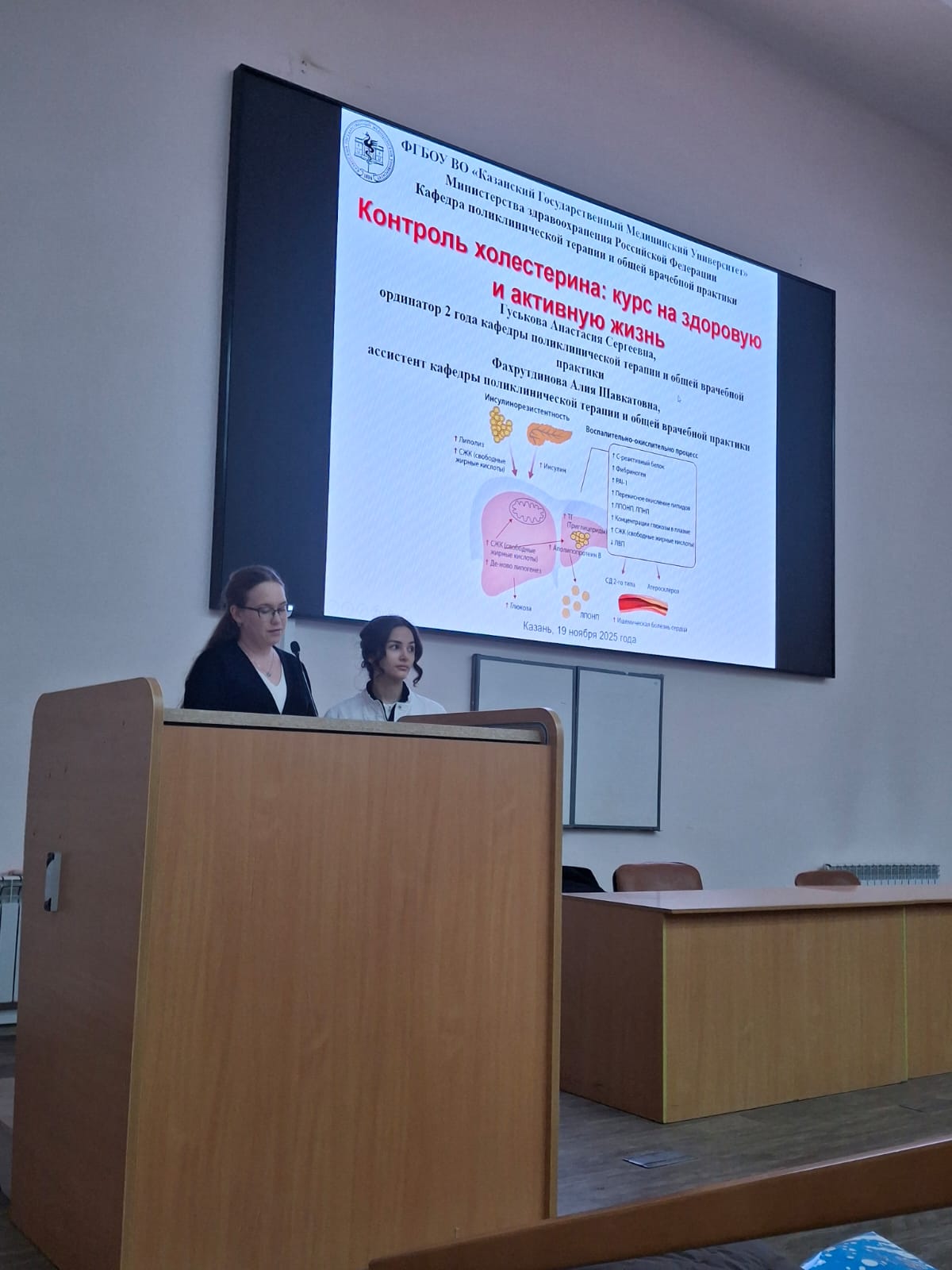 19 ноября 2025 г. в Казанском ГМУ в рамках проекта Университет третьего возраста "Здоровое долголетие. Основы взаимопомощи" ассистентом кафедры Фахрутдиновой А.Ш. и ординатором Гуськовой А.С. проведена Школа здоровья для пациентов "Контроль холестерина: курс на здоровую и активную жизнь". В работе Школы приняли участие более 50 слушателей. В интерактивном формате были разобраны определения сердечно-сосудистого риска, индивидуальные целевые уровни ХС-ЛПНП, возможности профилактики дислипидемии.