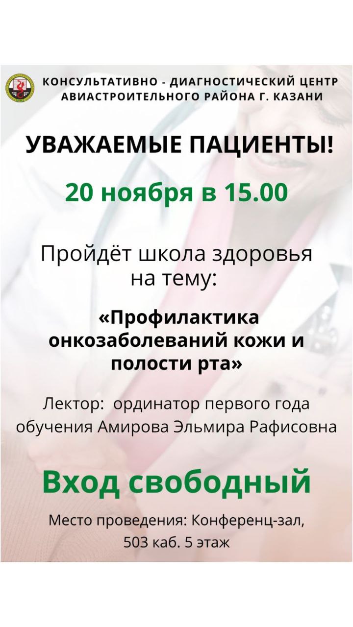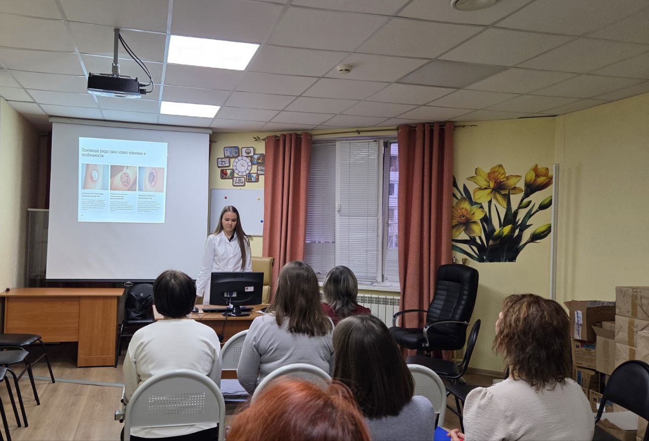 20 ноября на базе Консультативно-диагностического центра Авиастроительного района ординатор 1 года Амирова Эльмира Рафисовна под руководством к.м.н., асс. Нуриевой Альбины Рашидовны провела Школу здоровья для пациентов на актуальную тему: «Онкология кожи и ротовой полости: важность ранней диагностики и профилактики». В рамках проведенного мероприятия была подчеркнута важность ранней диагностики и профилактики, поскольку своевременное выявление подозрительных изменений значительно повышает шансы на успешное лечение и улучшает прогноз заболевания. С пациентами была проведена интерактивная викторина, благодаря которой участники смогли закрепить полученные знания об опасных изменениях на коже и в ротовой полости, а после нее они смогли попробовать себя в роли терапевтов, изучая особенности внешнего вида родинок и учась распознавать признаки, требующие обращения к специалисту. Такая практическая деятельность способствует повышению осведомленности, развитию навыков самонаблюдения и формированию ответственности за собственное здоровье. В результате участники получили ценные знания, которые помогут им своевременно заметить опасные изменения и обратиться за медицинской помощью, что является важным шагом в профилактике онкологических заболеваний.