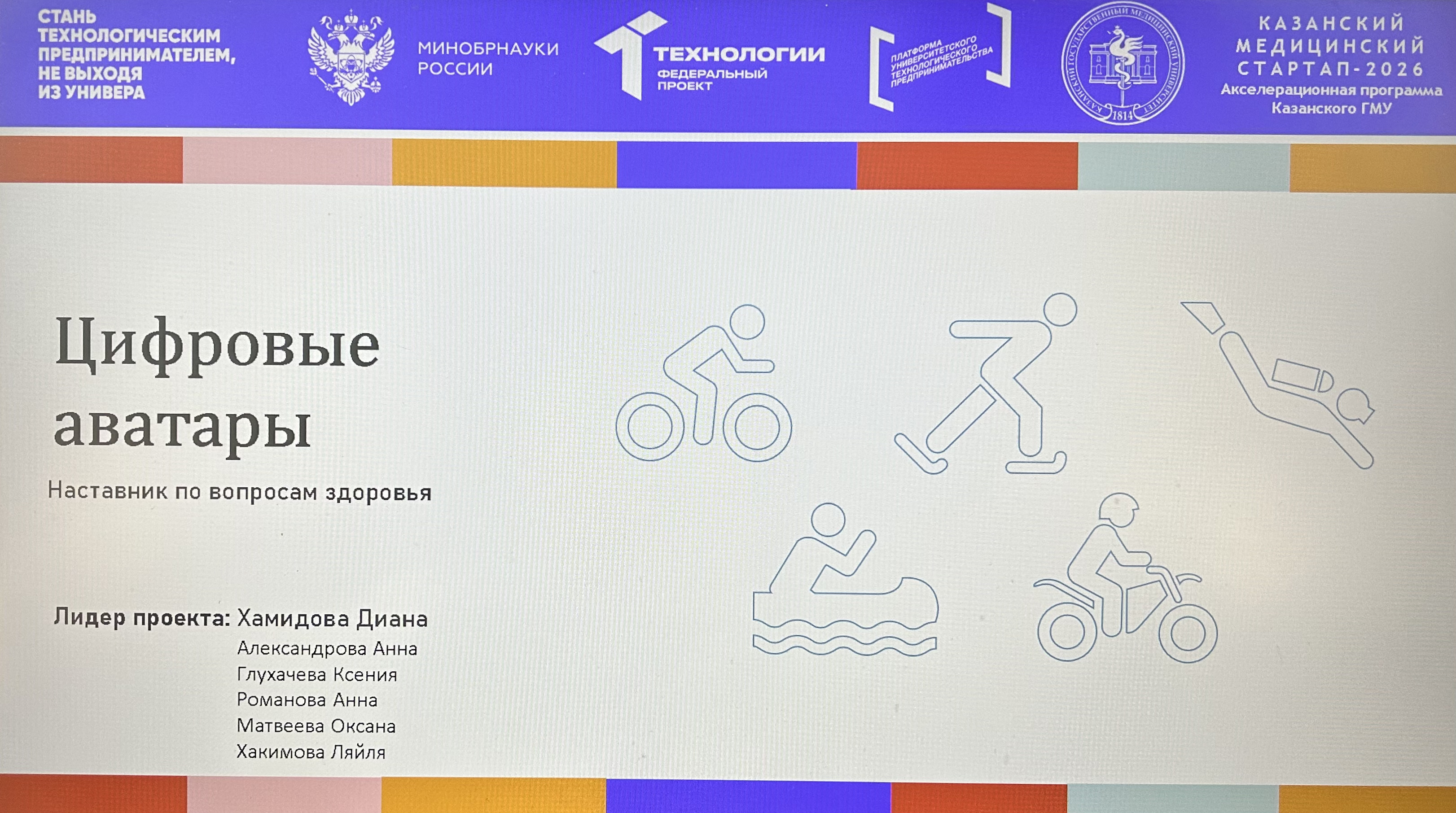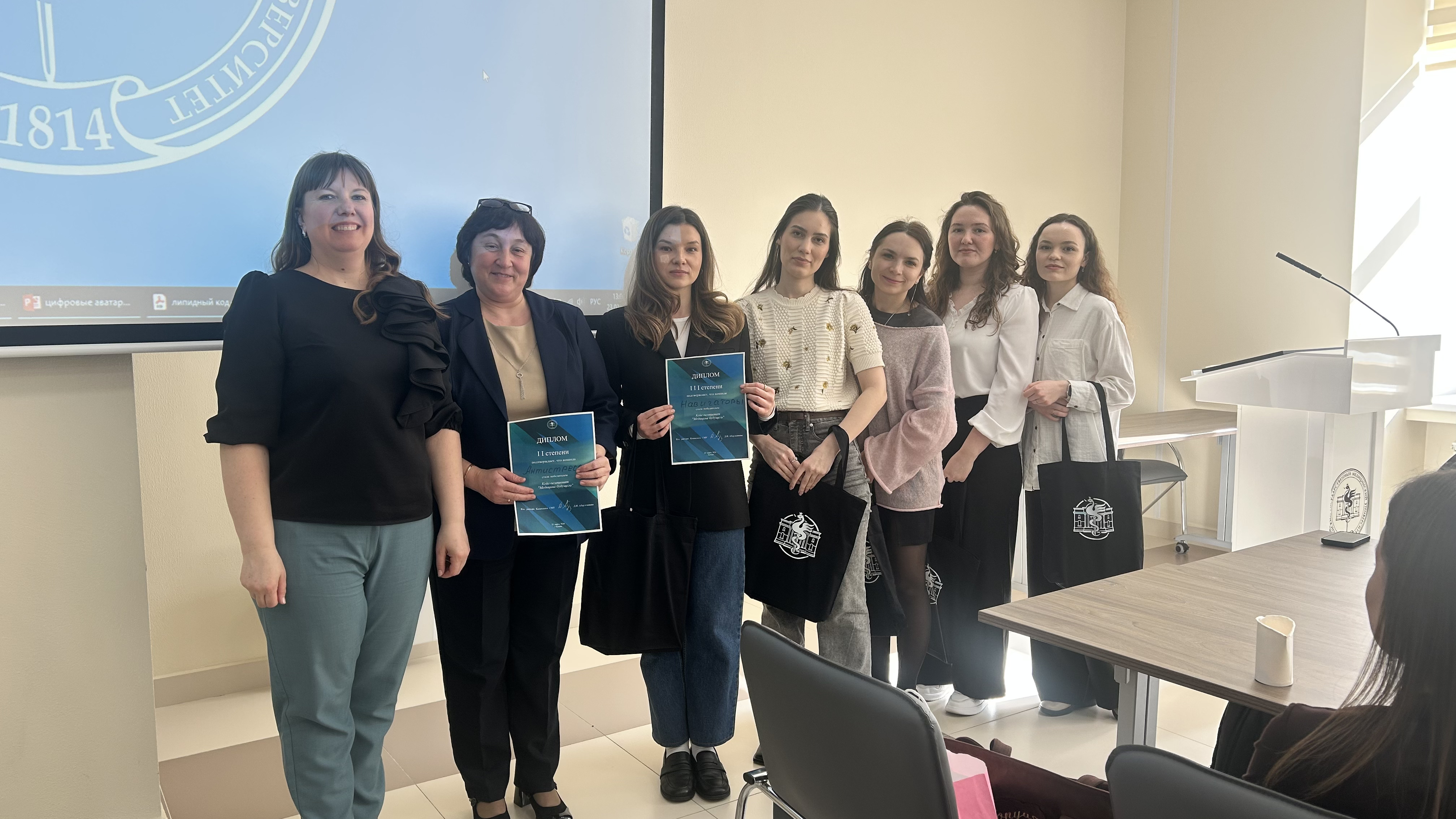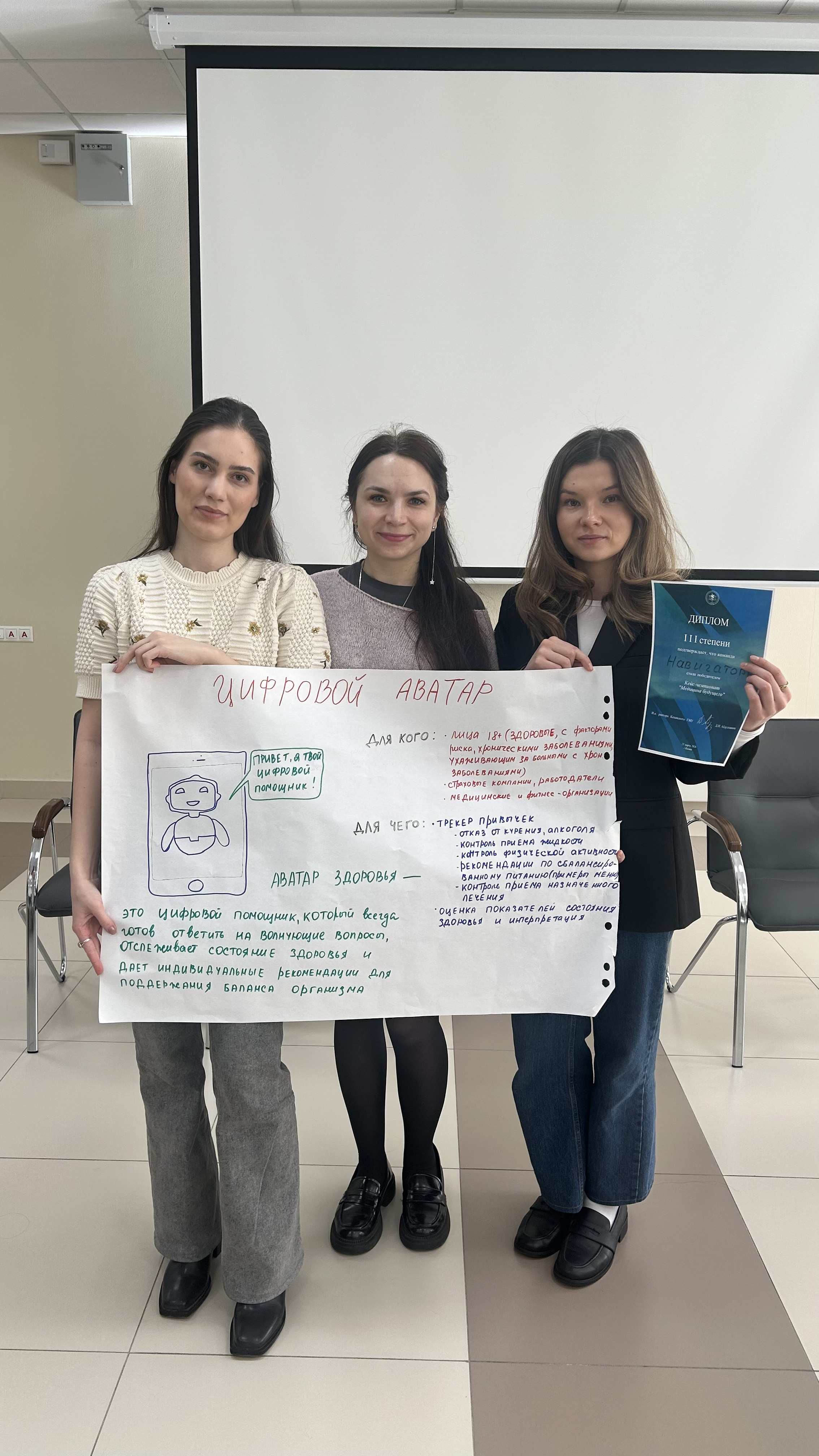 23.03.2026 в конференц-зале Казанского ГМУ прошло увлекательное мероприятие кейс-чемпионат «Медицина будущего». Команда ординаторов 1 года кафедры поликлинической терапии и общей врачебной практики Хамидова Диана(лидер), Александрова Анна, Глухачева Ксения, Романова Анна представили вариант решения задачи «Цифровые аватары - коучи по вопросам здоровья». Аватар здоровья - это цифровой помощник, который всегда готов ответить на волнующие вопросы, отслеживает состояние организма и дает индивидуальные рекомендации для поддержания баланса организма. На итоговой защите перед экспертами команда заняла III место.