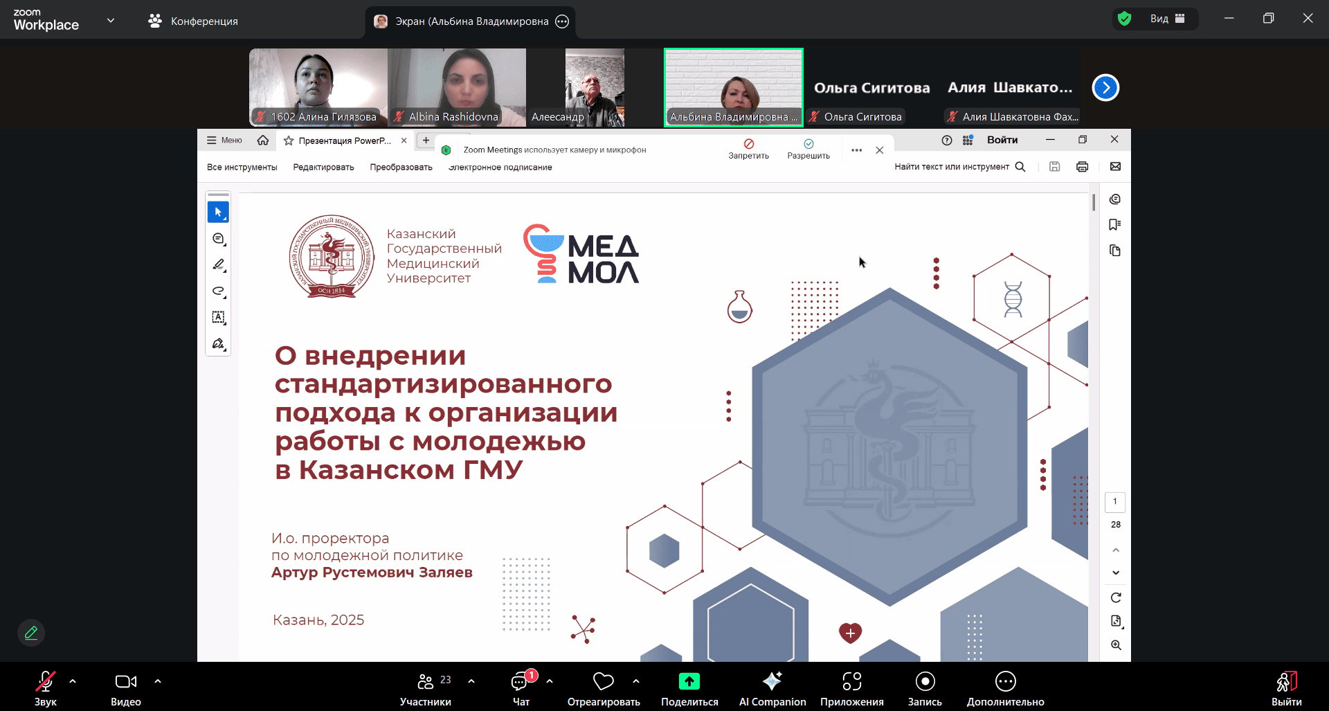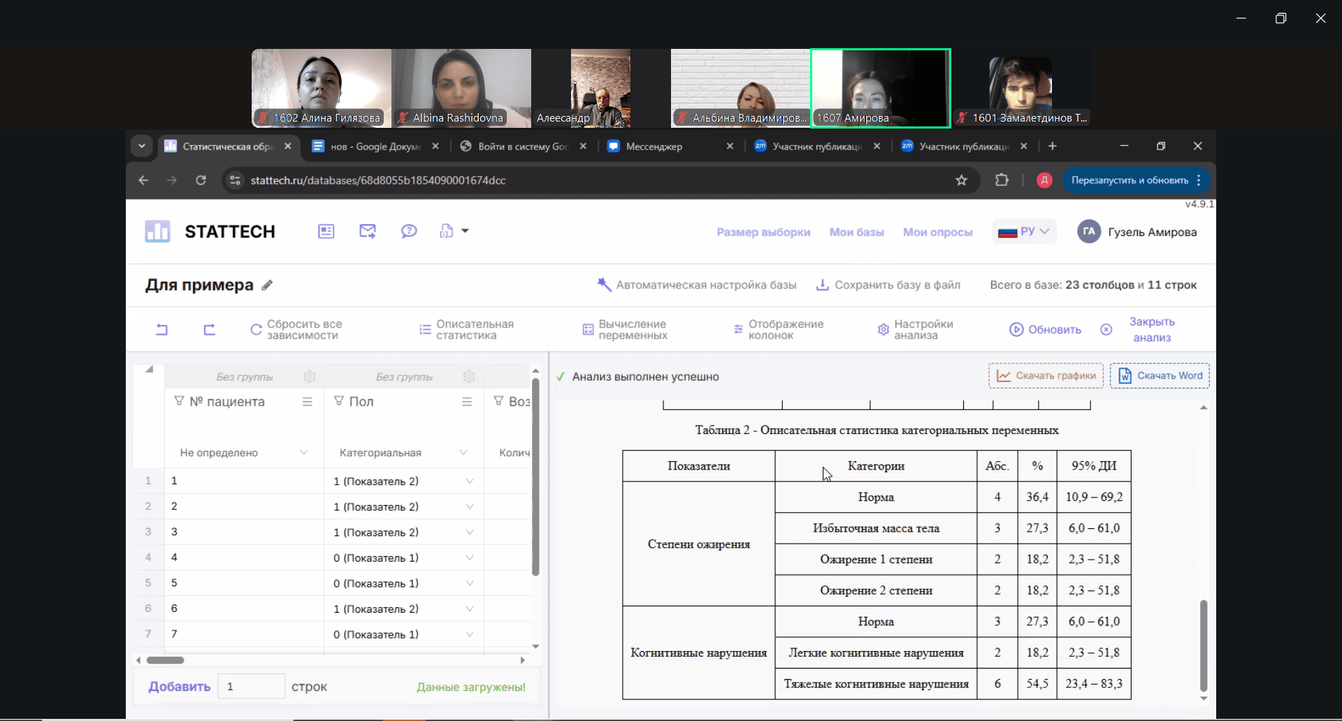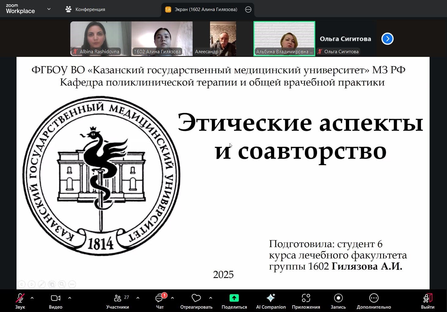 Заведующий кафедрой Синеглазова А.В. выступила с приветственной речью и представила основные аспекты стандартизированного подхода при организации работы с молодежью в Казанском ГМУ. В соответствии с повесткой были обсуждены организационные вопросы и план работы на 2025-2026 учебный год. Студент гр. 1602 Гилязова А. выступила с докладом «Этические аспекты и соавторство», в котором рассказала о важности соблюдения правил этики при написании и публикации научных работ, обеспечения конфиденциальности данных пациентов, принявших участие в исследовании. Студенты ознакомились с правилами, которые следует соблюдать при участии в написании НИР. Студент гр. 1607 Амирова Г. в режиме реального времени показала мастер-класс по статистической обработке данных в программном обеспечении Stattech.