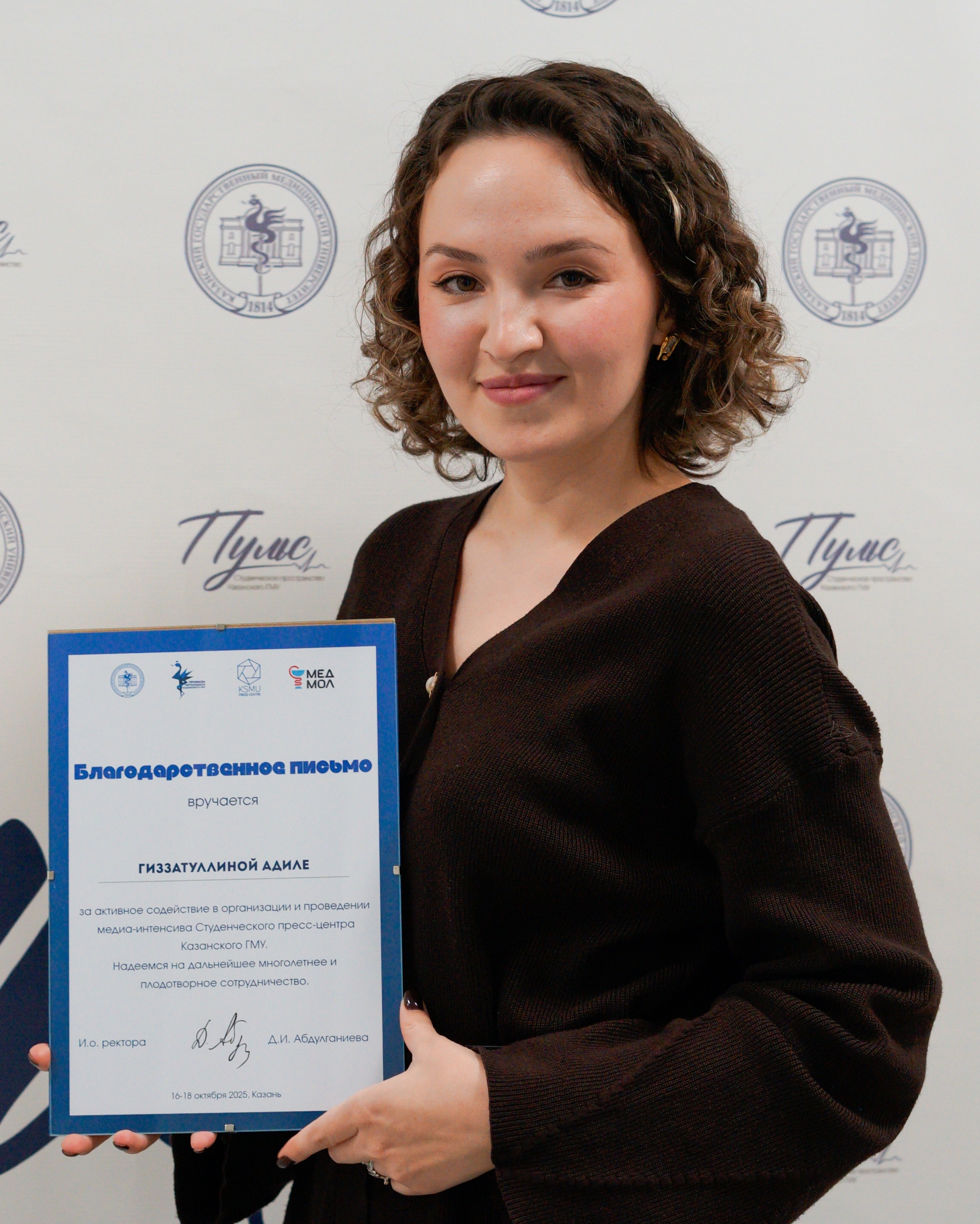 За активное содействие в организации и проведении медиа-интенсива Студенческого пресс-центра Казанского ГМУ Адиля Шамиловна награждена Благодарственным письмом.