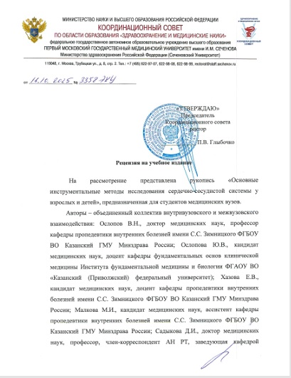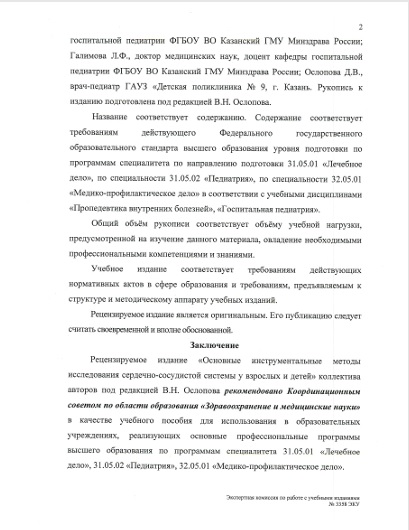 Издание «Основные инструментальные методы исследования сердечно-сосудистой системы у взрослых и детей» коллектива авторов под редакцией В. Н. Ослопова рекомендовано Координационным советом по области образования «Здравоохранение и медицинские науки» в качестве учебного пособия для использования в образовательных учреждениях, реализующих основные профессиональные программы высшего образования по программам специалитета 31.05.01 «Лечебное дело», 31.05.02 «Педиатрия», 32.05.01 «Медико-профилактическое дело».