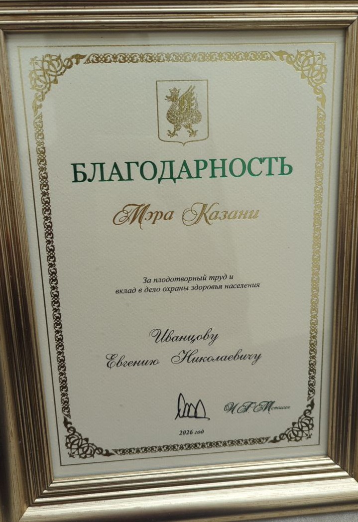 За плодотворный труд и вклад в дело охраны здоровья населения 25.02.2026 доцент кафедры пропедевтики внутренних болезней имени профессора С. С. Зимницкого Иванцов Евгений Николаевич награжден Благодарственным письмом Мэра г. Казани Ильсура Метшина.