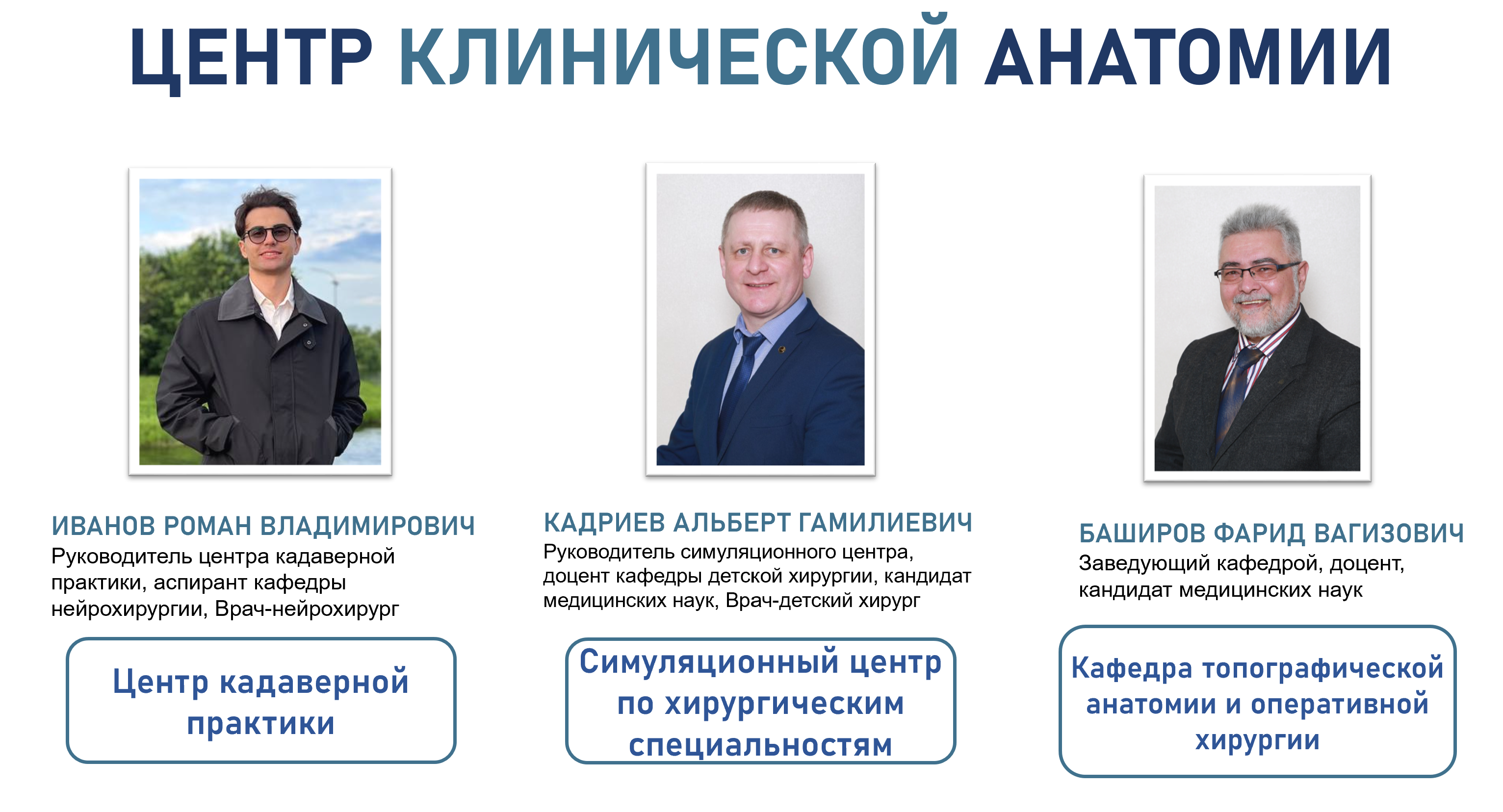 С 2025 года руководителем кадаверного центра является Иванов Роман Владимирович, врач-нейрохирург Детской республиканской клинической больницы, аспирант кафедры нейрохирургии. В этой должности он совмещает практический клинический опыт с организацией образовательного процесса. В сферу его ответственности входит разработка и реализация программ обучения, координация работы преподавательской команды и развитие сотрудничества с клиническими базами университета.