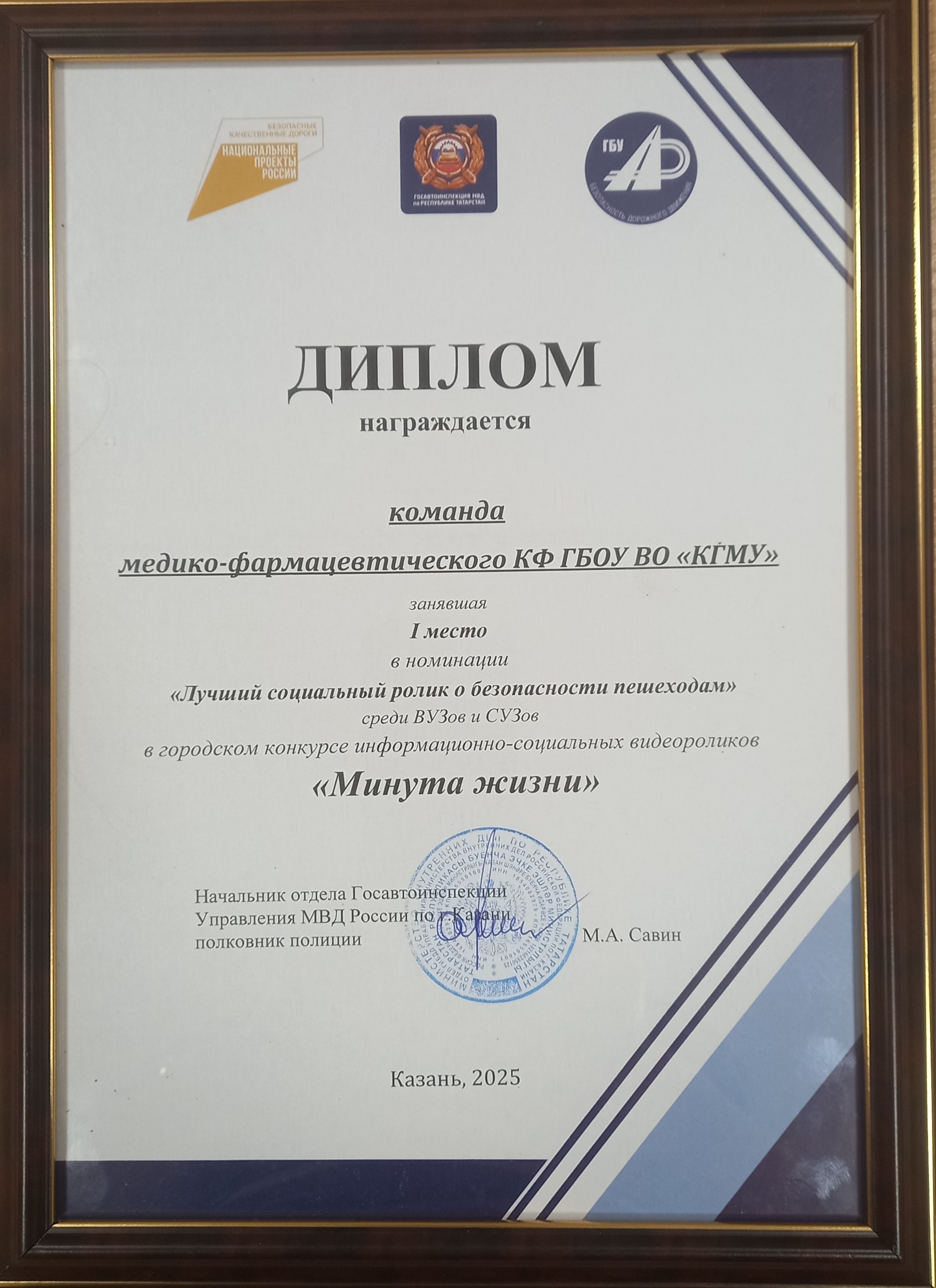 Обучающиеся Медико-фармацевтического колледжа Казанского ГМУ приняли участие в Городском конкурсе информационно-социальных видеороликов «Минута жизни», который был организован отделом ГИБДД Управления МВД России по г. Казани и Комитетом по делам детей и молодежи Исполнительного комитета г. Казани. Целью конкурса, проводимого среди ВУЗов и СУЗов, являлось правовое просвещение и пропаганда безопасности дорожного движения.