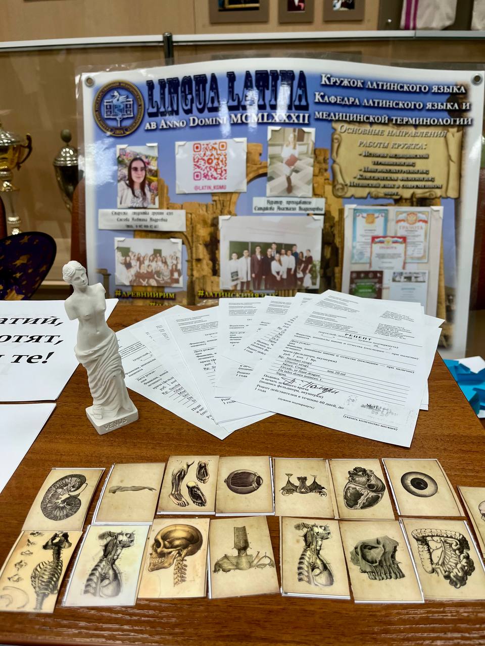 С научным кружком кафедры латинского языка учащихся знакомила староста кружка Сысоева Алевтина. Все, кому была интересна работа кружка нашей кафедры, имели возможность проверить свои знания, найдя перевод крылатых выражений на латинском языке, и попробовать свои силы в переводе анатомических терминов с русского на латинский. Также все желающие доставали из волшебной шляпы предсказания на латинском языке и узнавали о том, какая врачебная специальность ждет их в будущем.