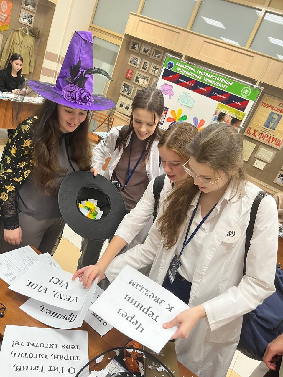 С научным кружком кафедры латинского языка учащихся знакомила староста кружка Сысоева Алевтина. Все, кому была интересна работа кружка нашей кафедры, имели возможность проверить свои знания, найдя перевод крылатых выражений на латинском языке, и попробовать свои силы в переводе анатомических терминов с русского на латинский. Также все желающие доставали из волшебной шляпы предсказания на латинском языке и узнавали о том, какая врачебная специальность ждет их в будущем.
