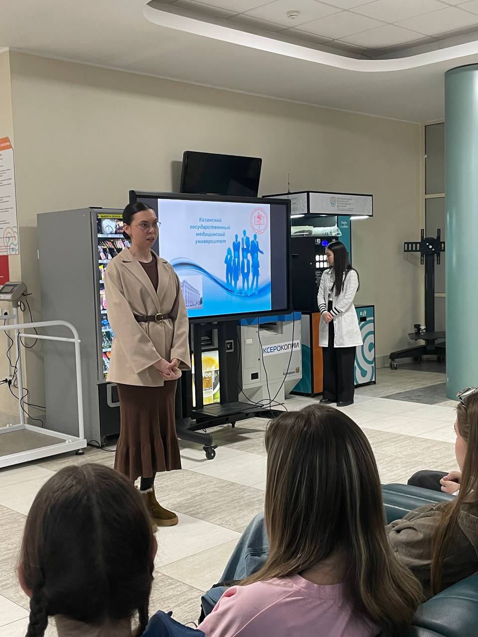 Андрей Викторович Ларюков, старший преподаватель кафедры общей патологии, куратор 1 курса медико-биологического факультета Фирюза Фанисовна Бикиниева и начальник отдела довузовского образования Юлия Валентиновна Пухова. Студентки факультета Алина Эльвировна Галяутдинова и Анжелика Араиковна Аракелян поделились со школьниками своим опытом и рассказали об особенностях студенческой жизни.