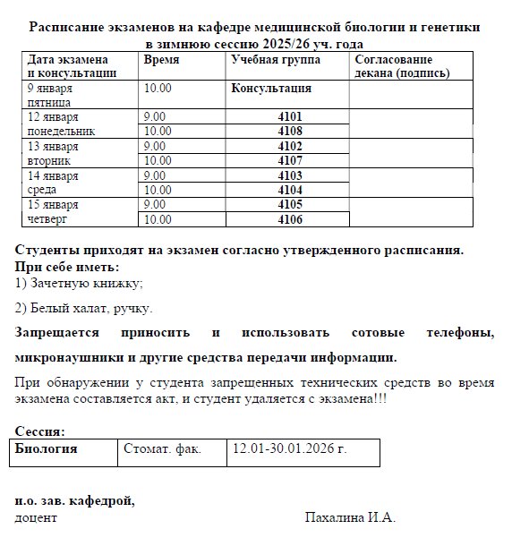 Расписание экзаменов на стоматологическом факультете 2025-2026 уч. год.