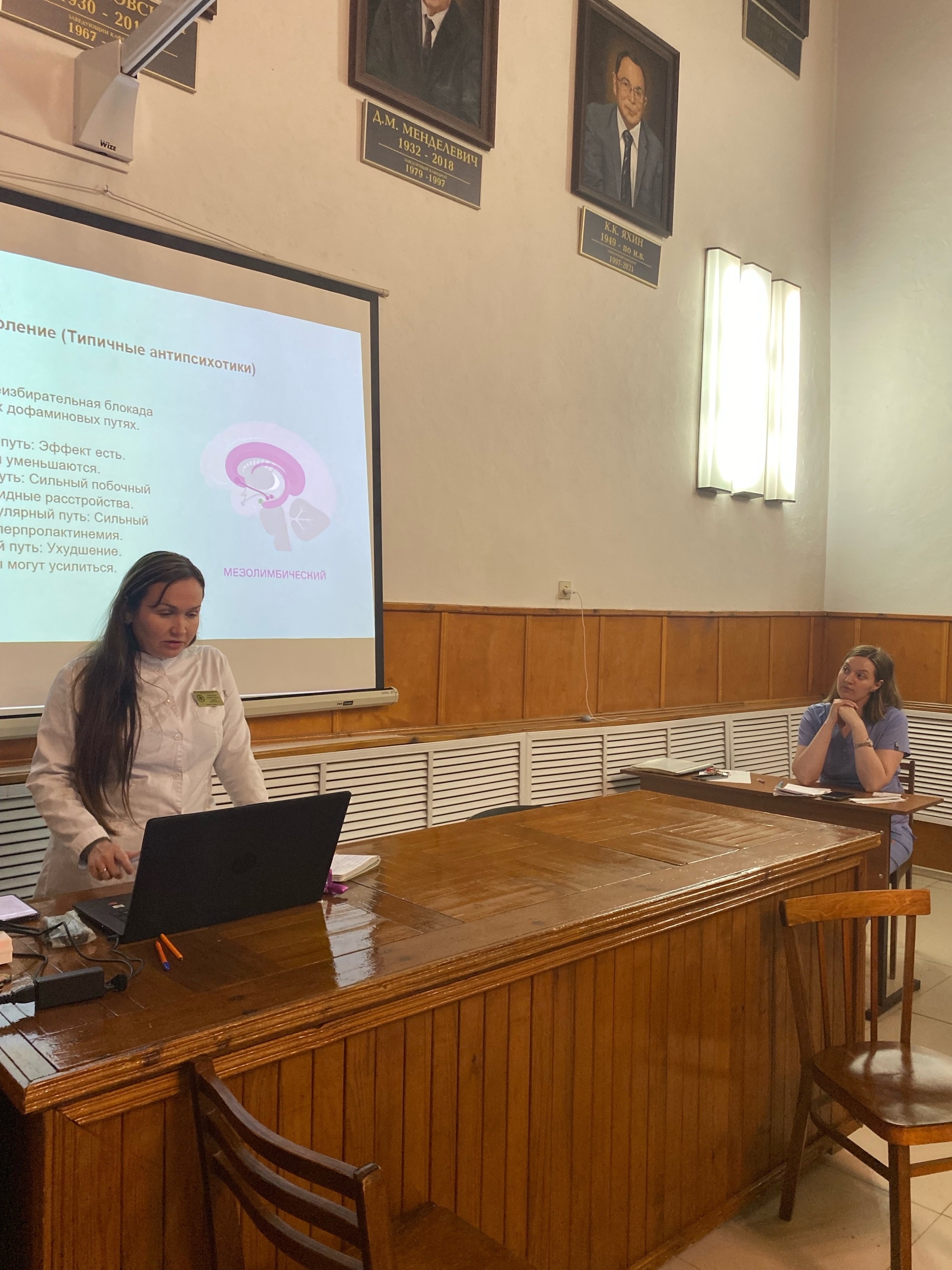Докладчик подготовил выступление по теме «Эволюция антипсихотиков». Сначала вспомнили, какое лечение было до возникновения лекарств. Разобрали классификацию антипсихотических средств, их мишени и механизмы действия, терапевтические и побочные эффекты. Благодаря «ревизору» задачей которого было дополнить или опровергнуть доклад, получилось прийти к обсуждению и уточнению важных деталей темы. Куратор привела пример из клинической практики, где можно было ярко отследить эффективность препарата и улучшение состояния пациента.