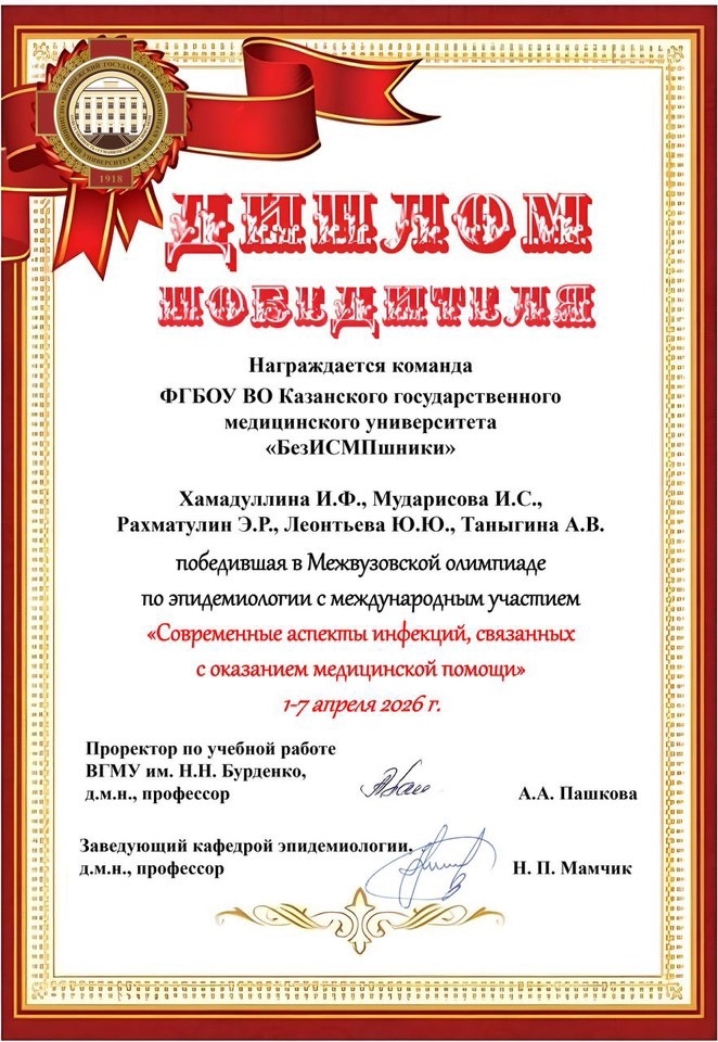 1-7 апреля 2026 г. на базе Воронежского государственного медицинского университета имени Н.Н. Бурденко состоялась Межвузовская онлайн-олимпиада по эпидемиологии с международным участием «Современные аспекты эпидемиологии инфекций, связанных с оказанием медицинской помощи».