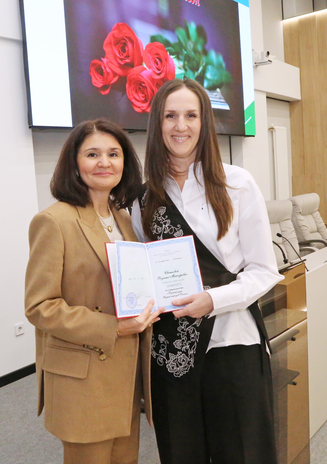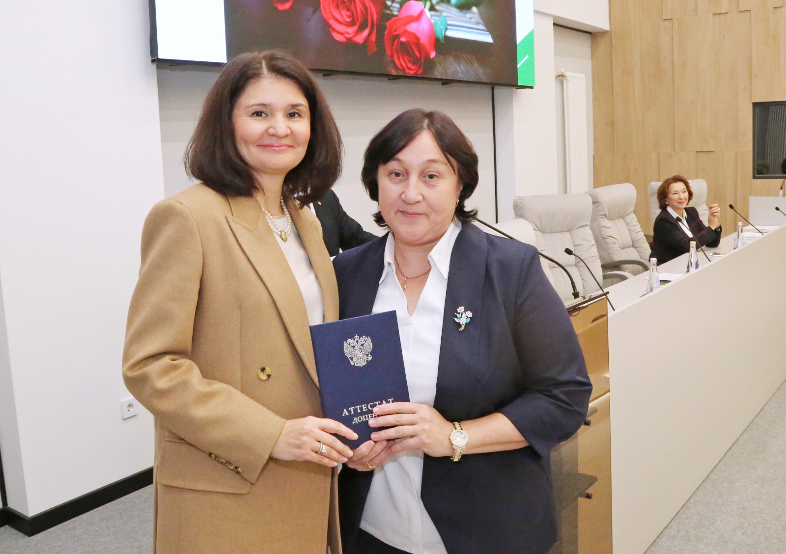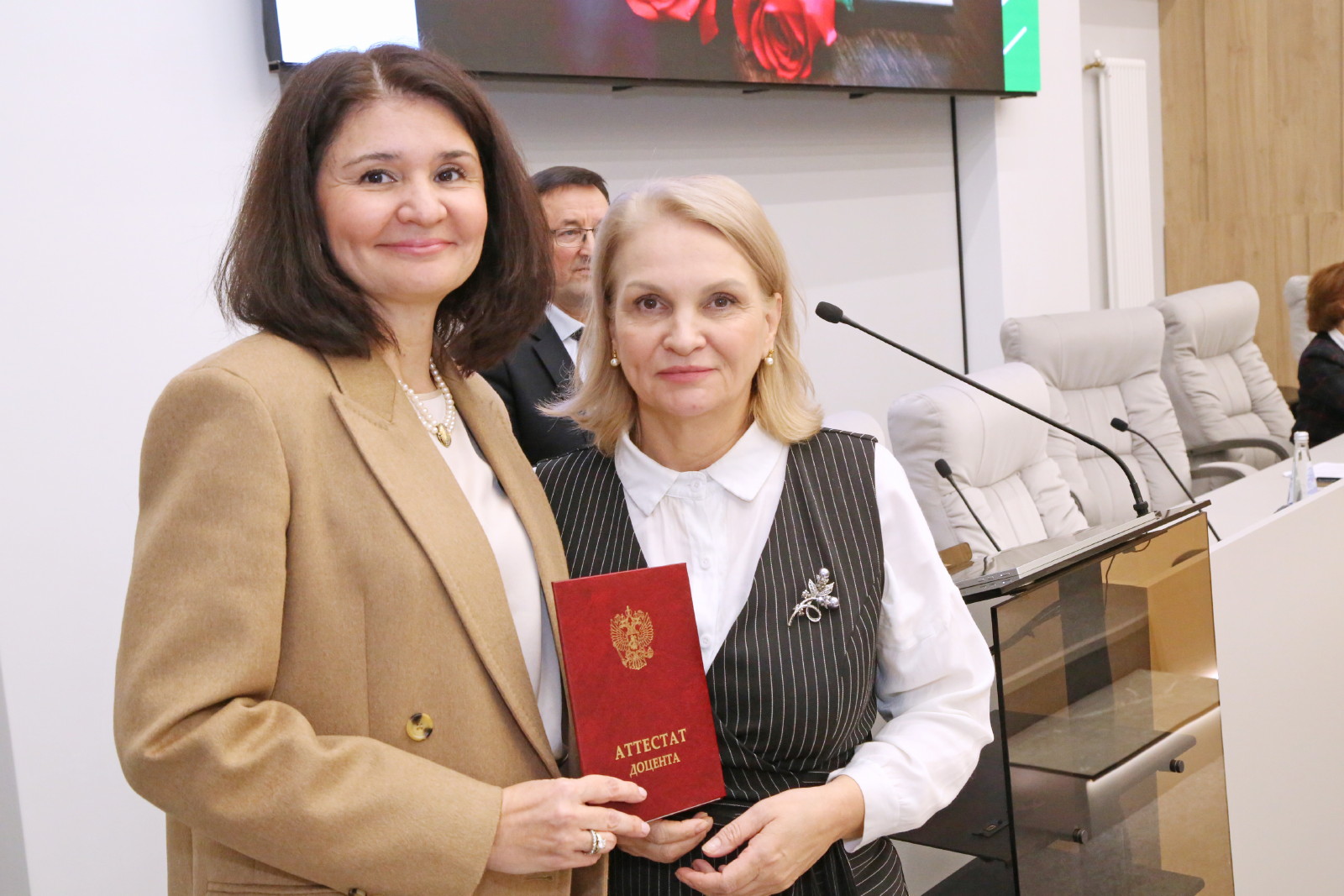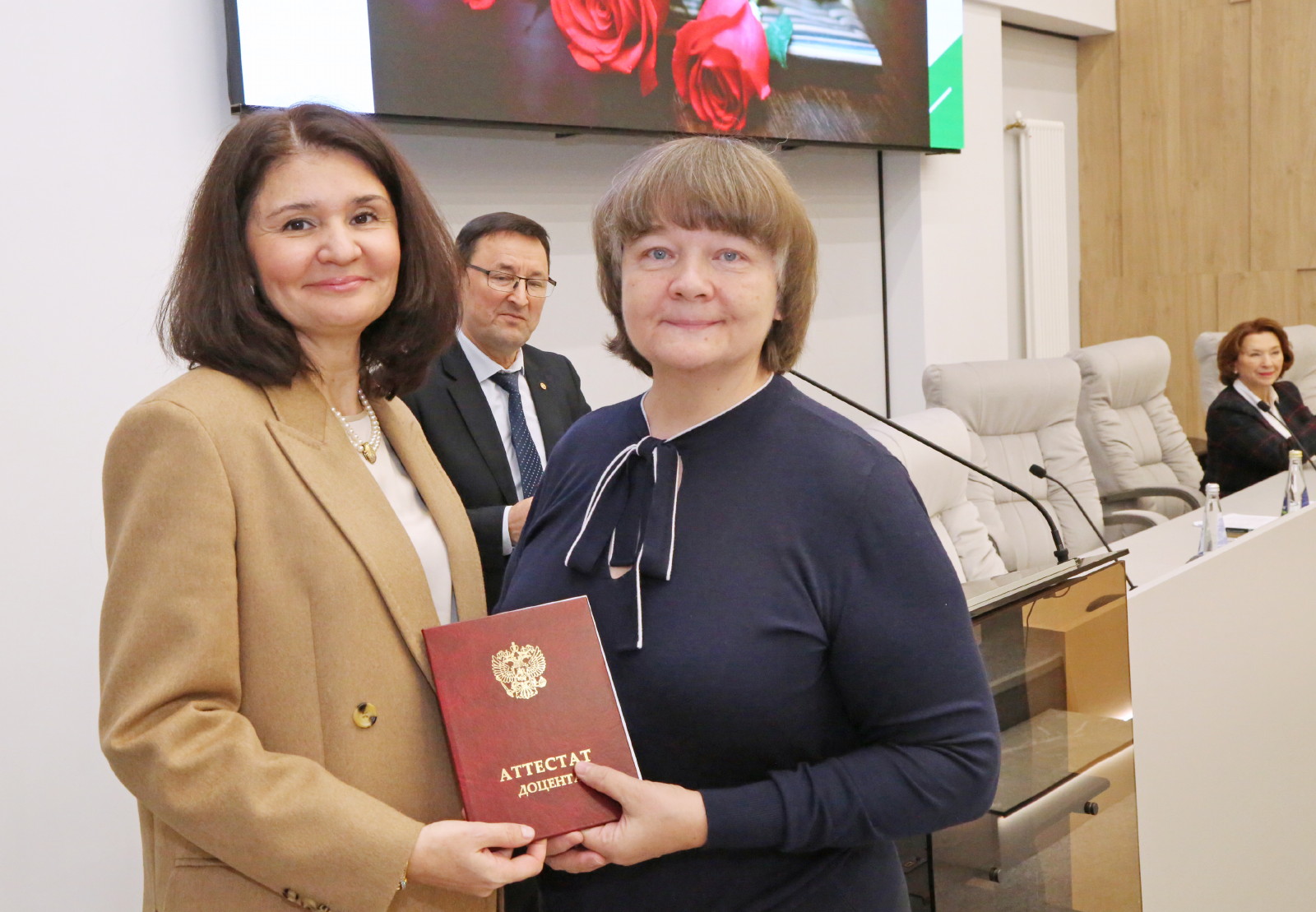 Аттестаты о присвоении ученого звания «профессор» были вручены Ирине Кравченко и Марату Мухамедьярову, ученого звания «доцент» – Саиде Аглиуллиной, Айдару Закирову, Лейсан Ибрагимовой, Елене Курмаевой, Розалии Светловой, Айгуль Мутигуллиной, Рамилю Мухамедзянову, Дине Сабировой и Ольге Торгашовой.