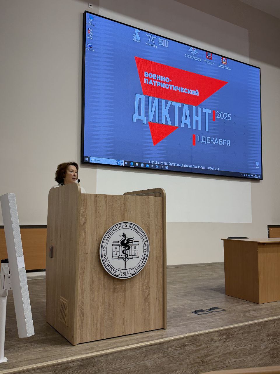 01 декабря в лекционной аудитории «Добровольцы» Казанского медуниверситета прошла IV Ежегодная всероссийская просветительская акция «Военно-патриотический диктант-2025». С приветственным словом к обучающимся Казанского ГМУ обратилась первый проректор вуза Лайсан Мухарямова, пожелавшая участникам акции успешной сдачи «экзамена»