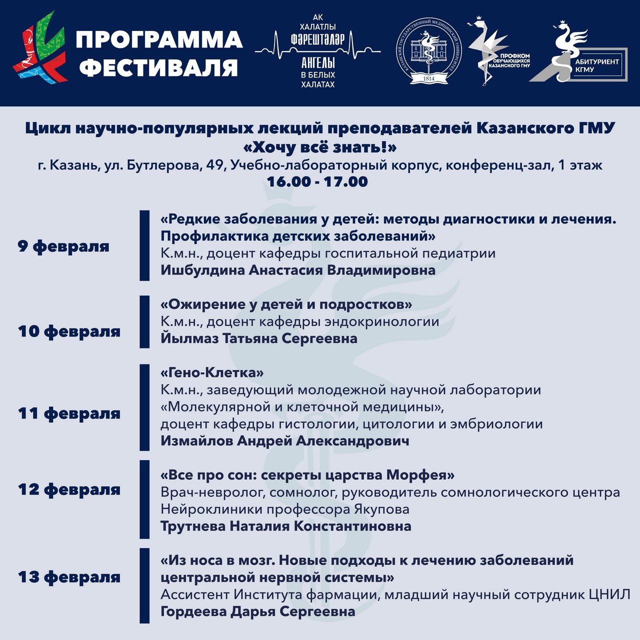 С 9 по 13 февраля ежедневно в 16.00 лучшие преподаватели Казанского ГМУ будут читать популярные лекции на медицинскую и социальную тематику.
