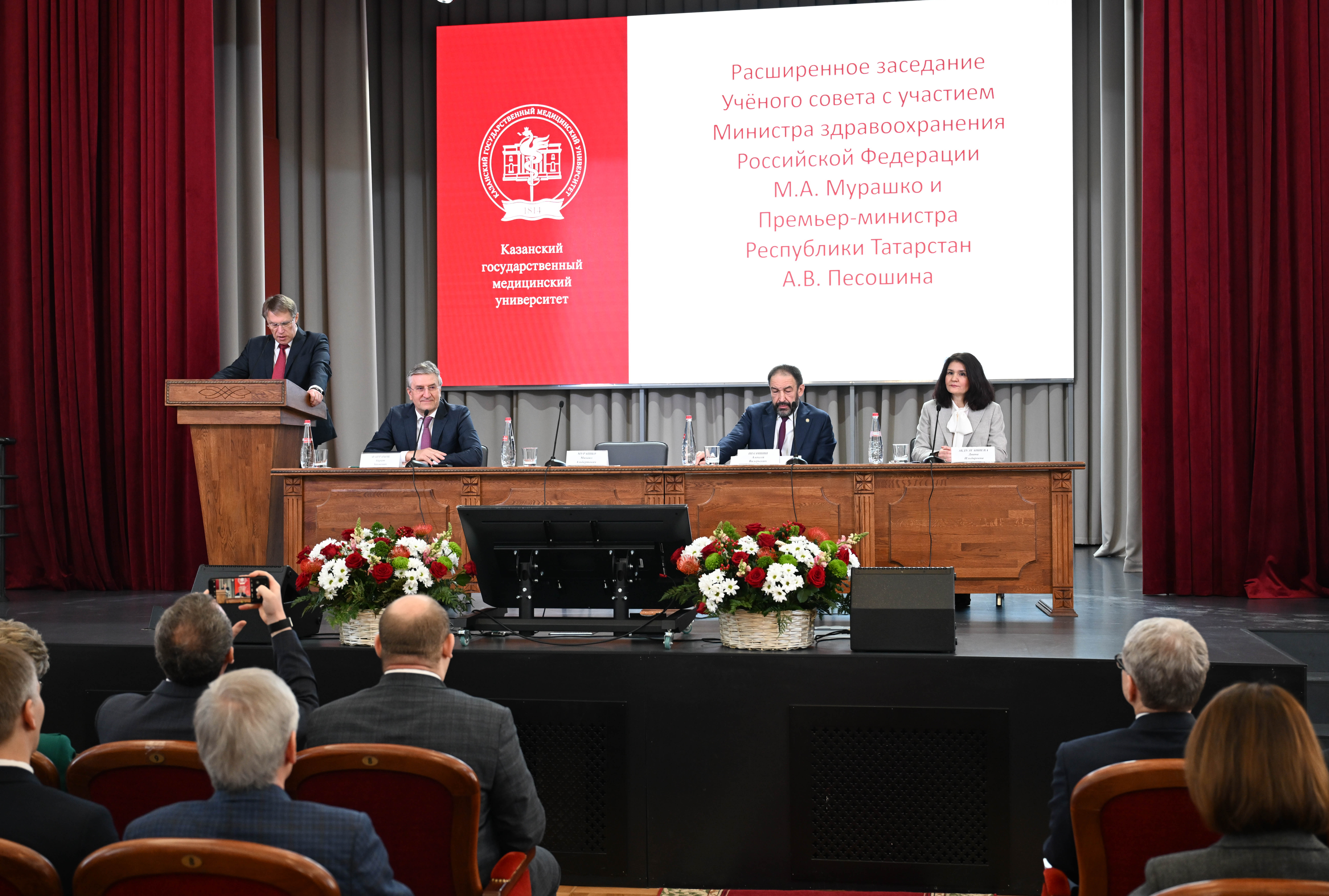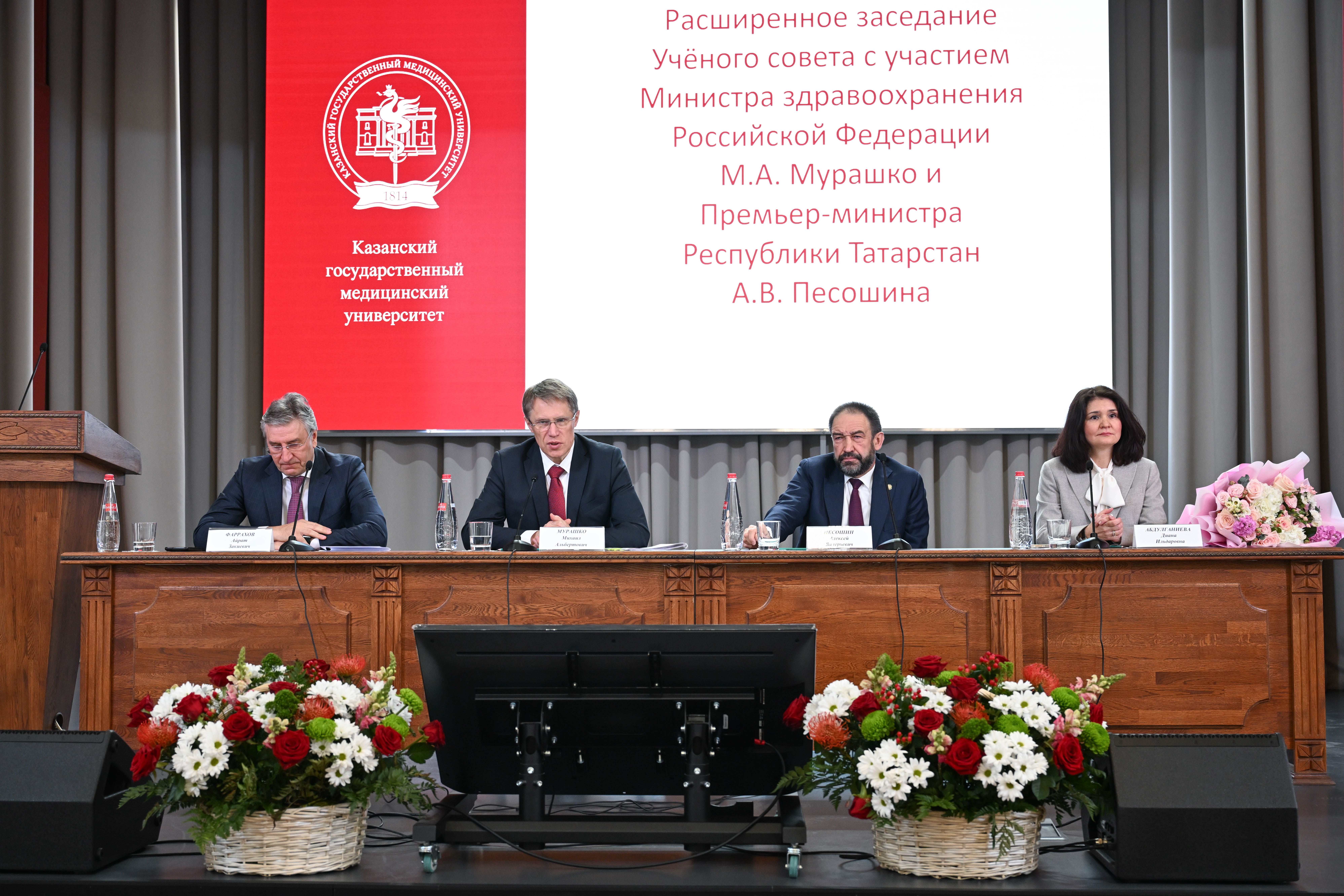 Премьер-министр Татарстана Алексей Песошин и министр здравоохранения России Михаил Мурашко представили коллективу Казанского государственного медицинского университета нового исполняющего обязанности ректора - им стал Айрат Фаррахов.