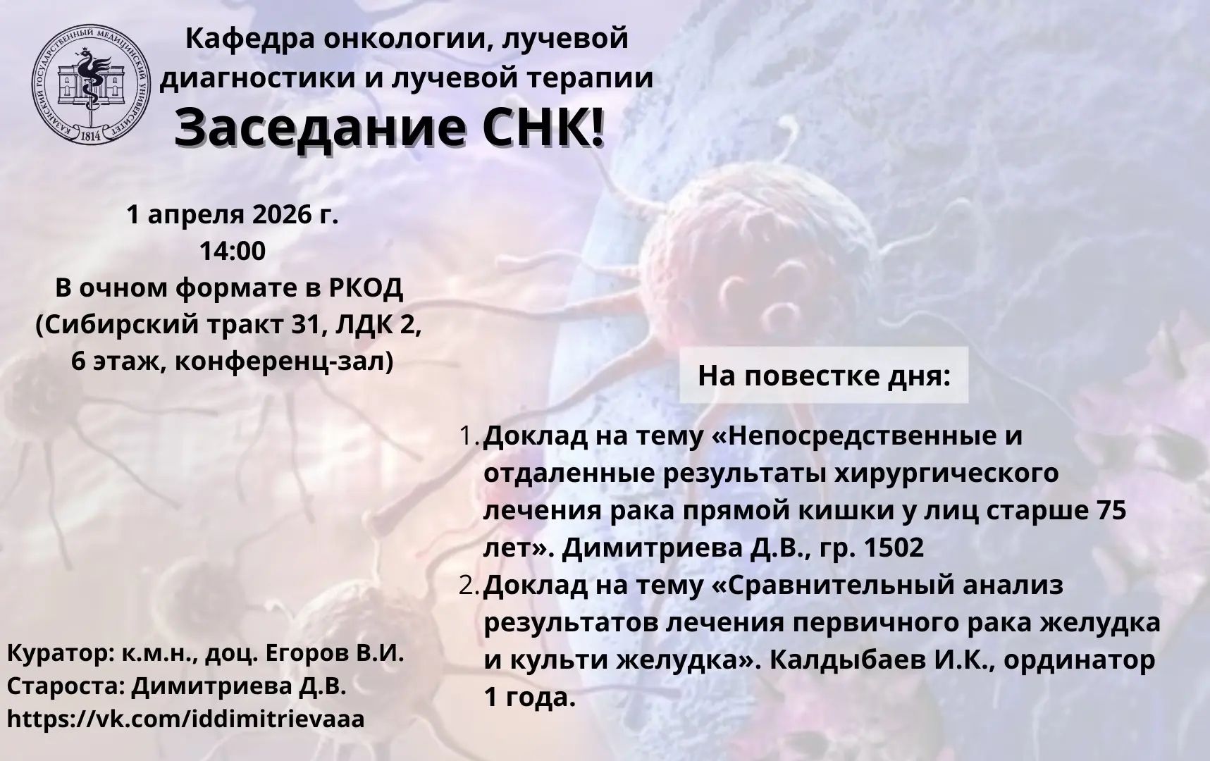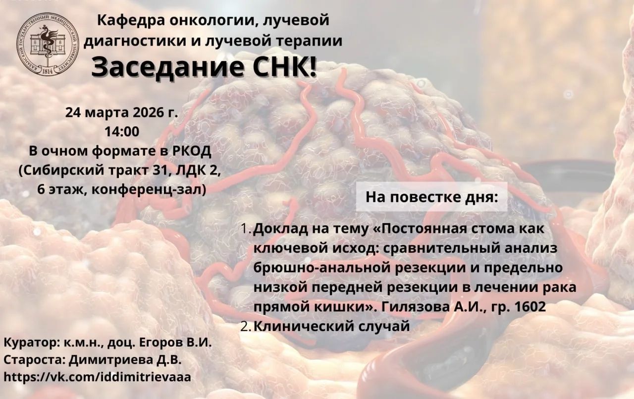 Заседания СНК кафедры онкологии, лучевой диагностики и лучевой терапии проходят на базе Республиканского клинического онкологического диспансера МЗ РТ (Сибирский тракт, 31, ЛДК №2, конференц-зал, 6 этаж).