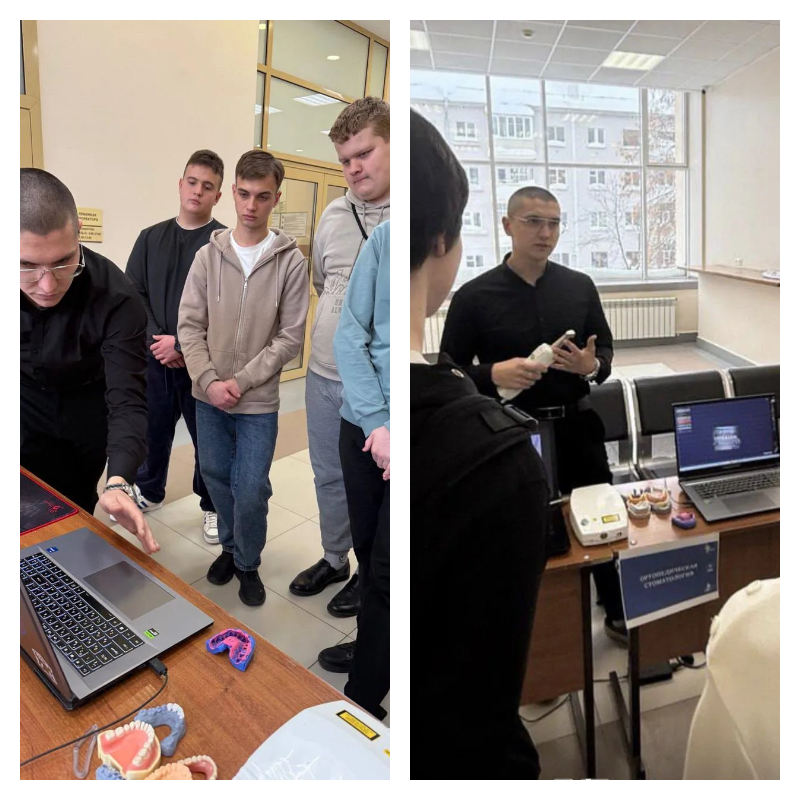 На втором дне фестиваля «Ак халатлы фәрештәләр – Ангелы в белых халатах» (8 февраля) Студенческие научные кружки «Наука PRO» провели мастер-классы. Нашу кафедру представлял староста СНК Наилов Салават, который ознакомил с одним из современных направлениях цифровой стоматологии - внутриротовым сканером. Он показал снятие оттиска на фантоме и моделировку его на компьютере.