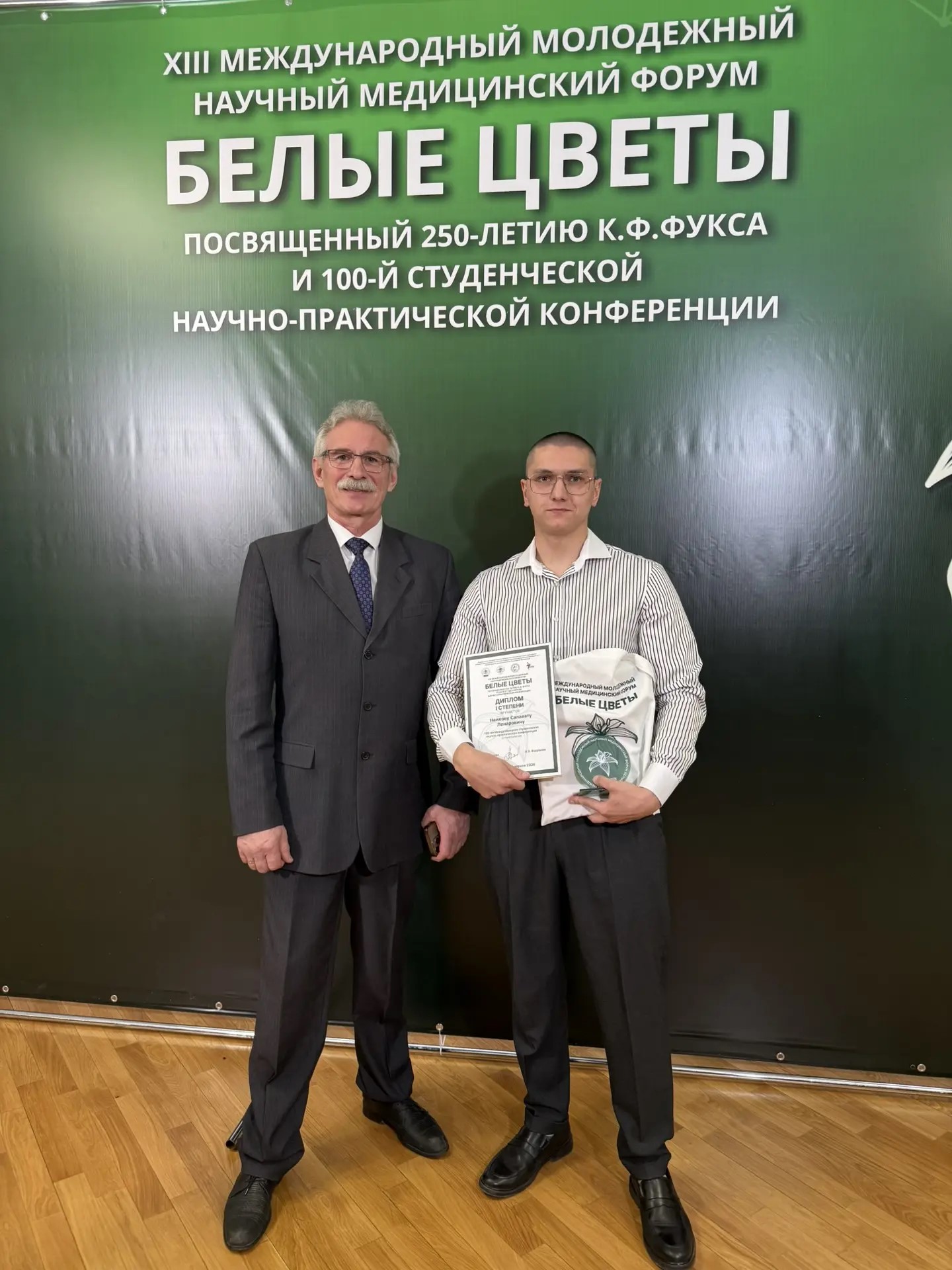 В рамках XIII Международного молодёжного научно медицинского форума "Белые цветы" посвященного 250-летию К.Ф.Фукса 15 апреля 2026г. прошла на 29-ая Международная медико-историческая конференция, посвящённой 125-летию со дня основания СНО им. И.А. Студенцовой. На ней студенты Юнусова Д.А., группы 4305 и Закирова А.И., группа 4306 получили Диплом II степени за устный доклад "Преемственность поколений: сотрудники кафедры ортопедической стоматологии КГМИ в развитии методов протезирования при микростомии" (научные руководители д.м.н., профессор Г.Т.Салеева и к.м.н., доцент Г.Н.Юдиной)