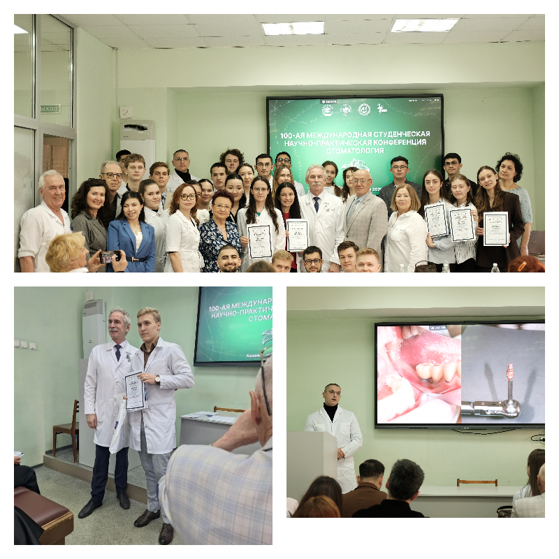 16 апреля на 100-ой Международной студенческой научно-практической конференции от нашей кафедры выступали студенты СНК , которые заняли призовые места : Наилов Салават - Диплом I степени за устный доклад «Сравнительное исследование неинвазивного метода оценки толщины десны на основе сопоставления цифровых данных» , Винокуров Алексей и Фарзалиев Ниджат- Дипломы II степени за стендовые доклады.