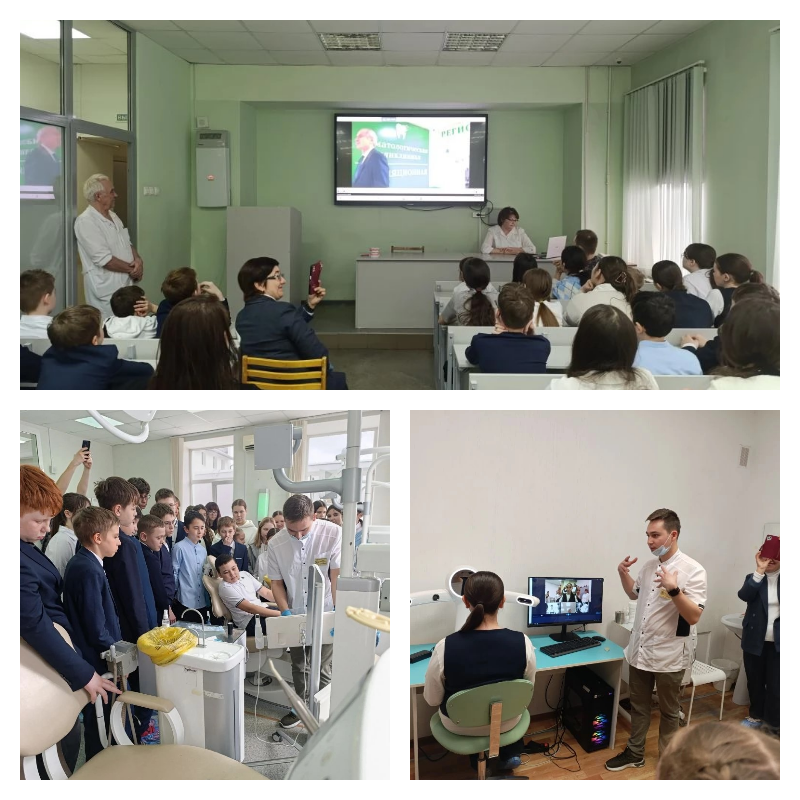 17 апреля 2026 в рамках профориентационной работы нашу поликлинику посетил 6Г класс гимназии №6 с ознакомлением с профессией врача стоматолога. Старший преподаватель и врач стоматолог ортопед Валеев Мансур Басирович провел экскурсию по стоматологической поликлинике, ознакомил с деятельностью врача стоматолога ортопеда, показал снятие оттисков. Ординатор кафедры Осадчий Вячеслав ознакомил с возможностями интраорального и лицевого сканера. Также ребятам показали фильмы о профилактике стоматологических заболеваний, истории кафедры ортопедической стоматологии и о возможностях современных технологиях моделирования ортопедических конструкций. Встреча прошла в дружеской обстановке – школьники задавали много вопросов - их интересовало все.