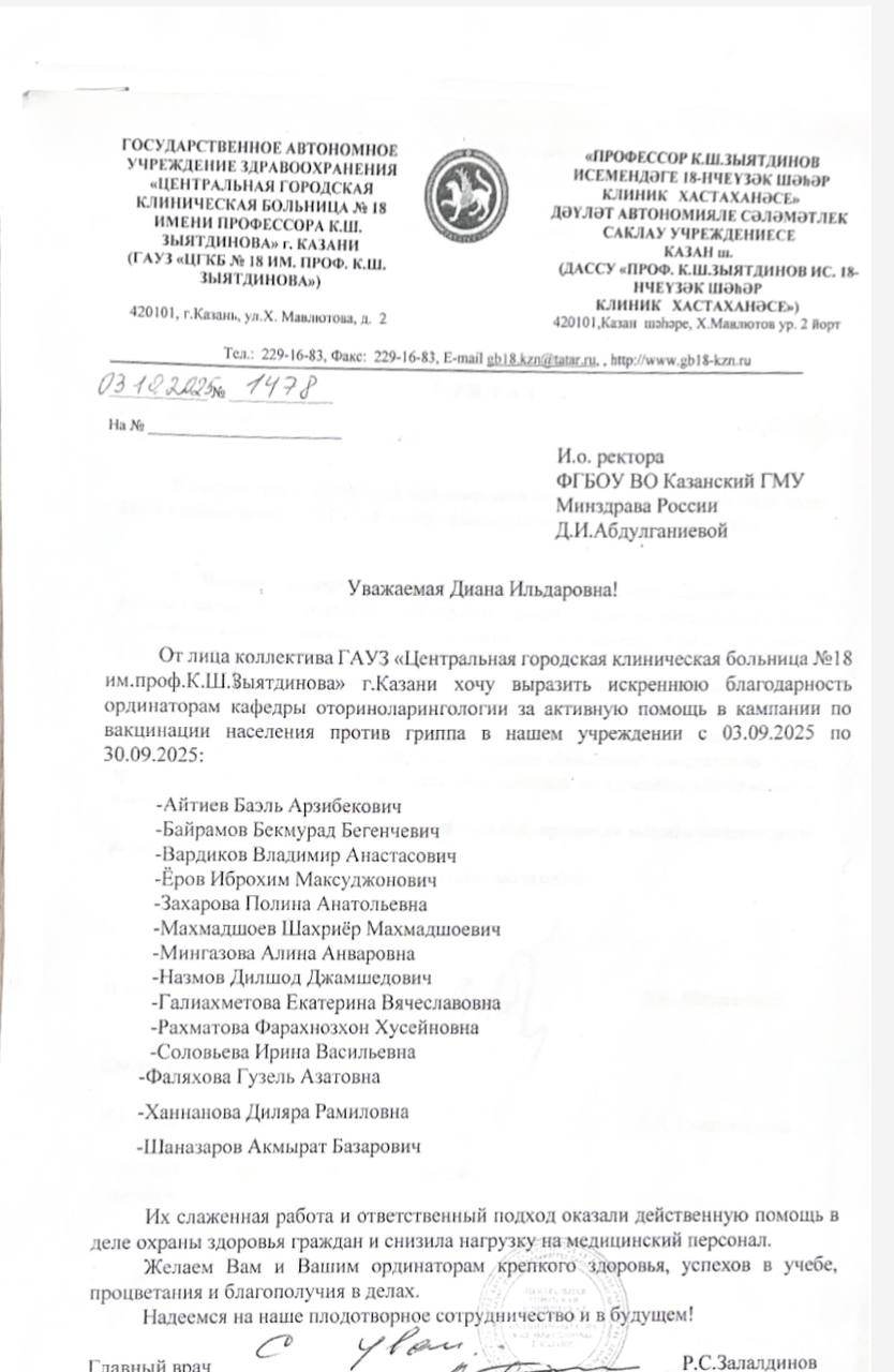 ГАУЗ ЦГКБ №18 выразила благодарность кафедре оториноларингологии и ординаторам КГМУ Казань