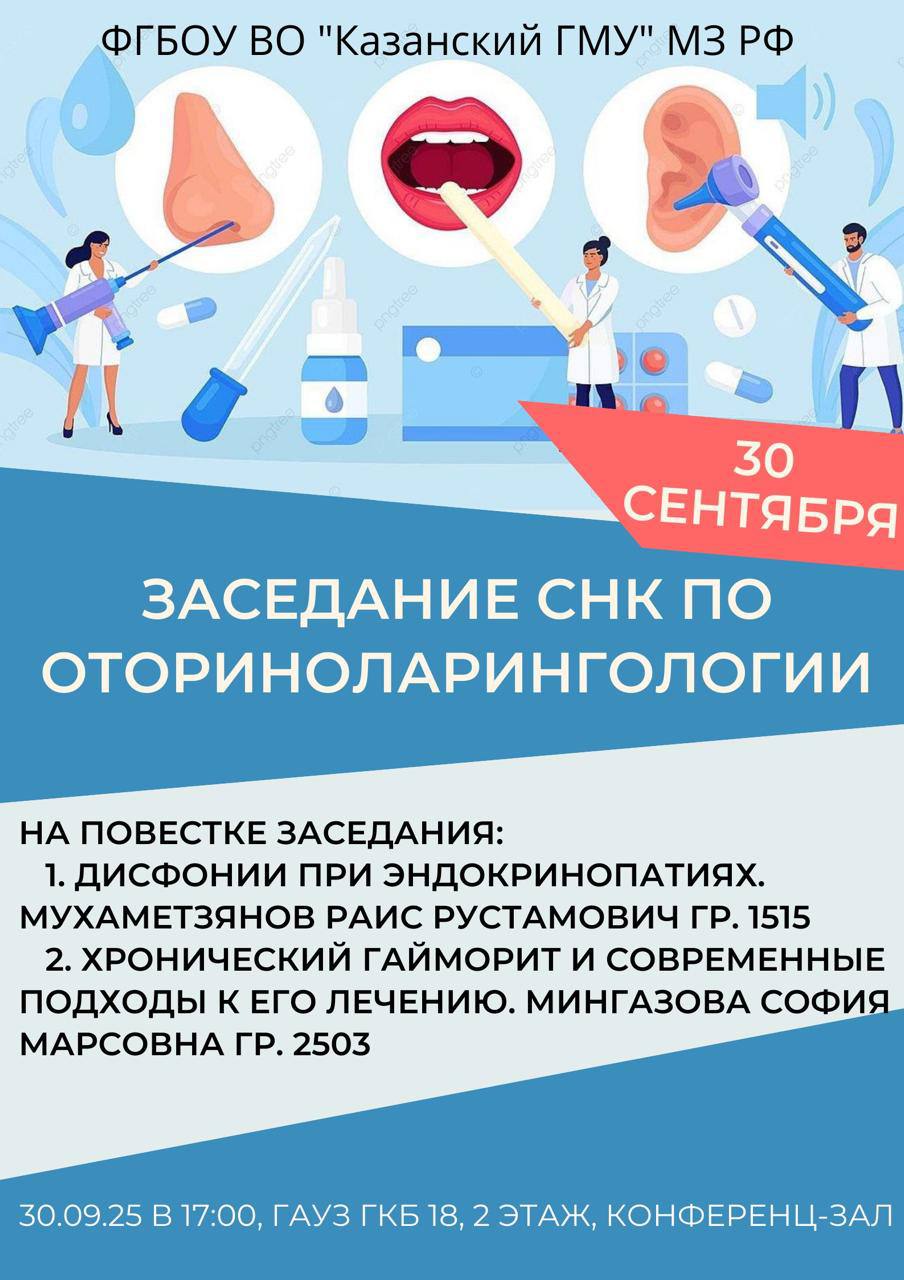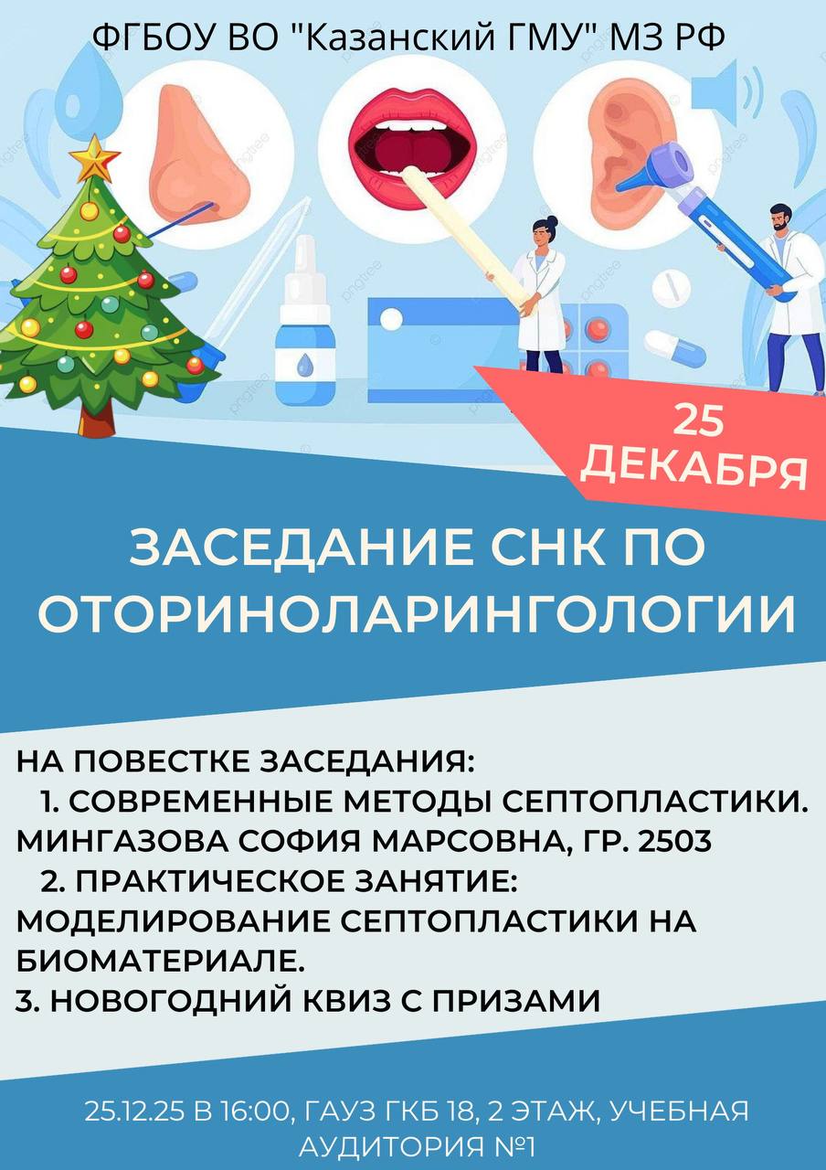 Заседание кружка проходят на кафедре оториноларингологии по адресу г. Казань, ул. Мавлютова, д.2а, ГБ №18, 2 этаж, актовый зал.