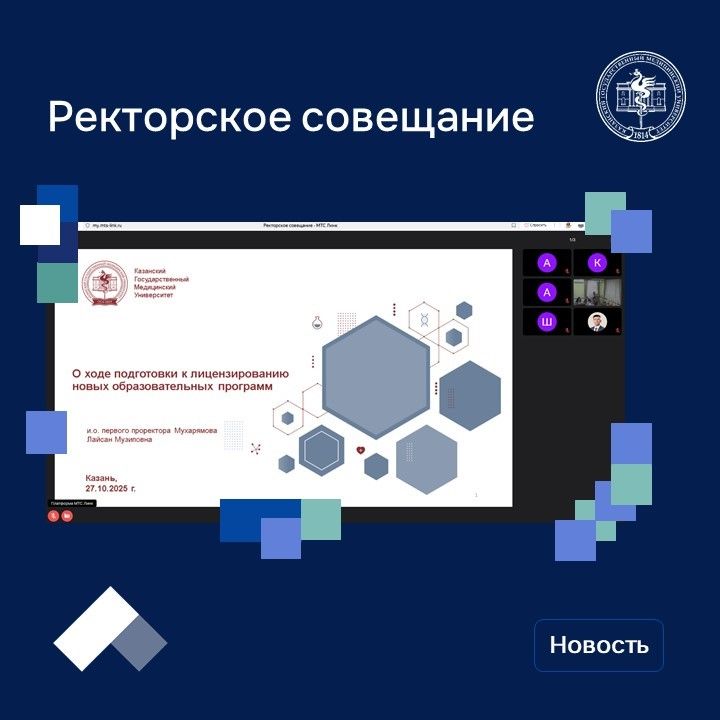 На прошедшем 27 октября 2025 г. в гибридном формате ректорском совещании и.о.первого проректора Л.М. Мухарямова выступила с докладом по вопросу "О ходе подготовки к лицензированию новых образовательных программ". В докладе было озвучено текущее положение и планы по подготовке и лицензированию образовательных программ "Лабораторная генетика", "Генетика" и "Клиническая психология". Данные образовательные программы разрабатываются в рамках реализации проекта СЦ-3 П-4 "Новые основные образовательные программы" Программы развития Казанского ГМУ на 2025-2036 гг.