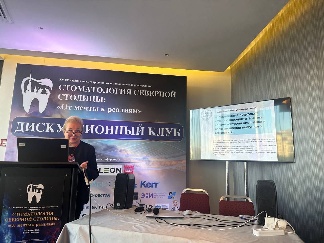 8.10.2025 кафедра терапевтической стоматологии приняла активное участие в работе XV Юбилейной международной научно-практической конференции “СТОМАТОЛОГИЯ СЕВЕРНОЙ СТОЛИЦЫ: “От мечты к реалиям”. На пленарном заседании представили доклад на тему “Современный подход к лечению пародонтита через призму контроля биопленки и восстановления иммунного гомеостаза” Блашкова С.Л., д.м.н., профессор, в соавторстве с Крикун Е.В., к.м.н., доцент.