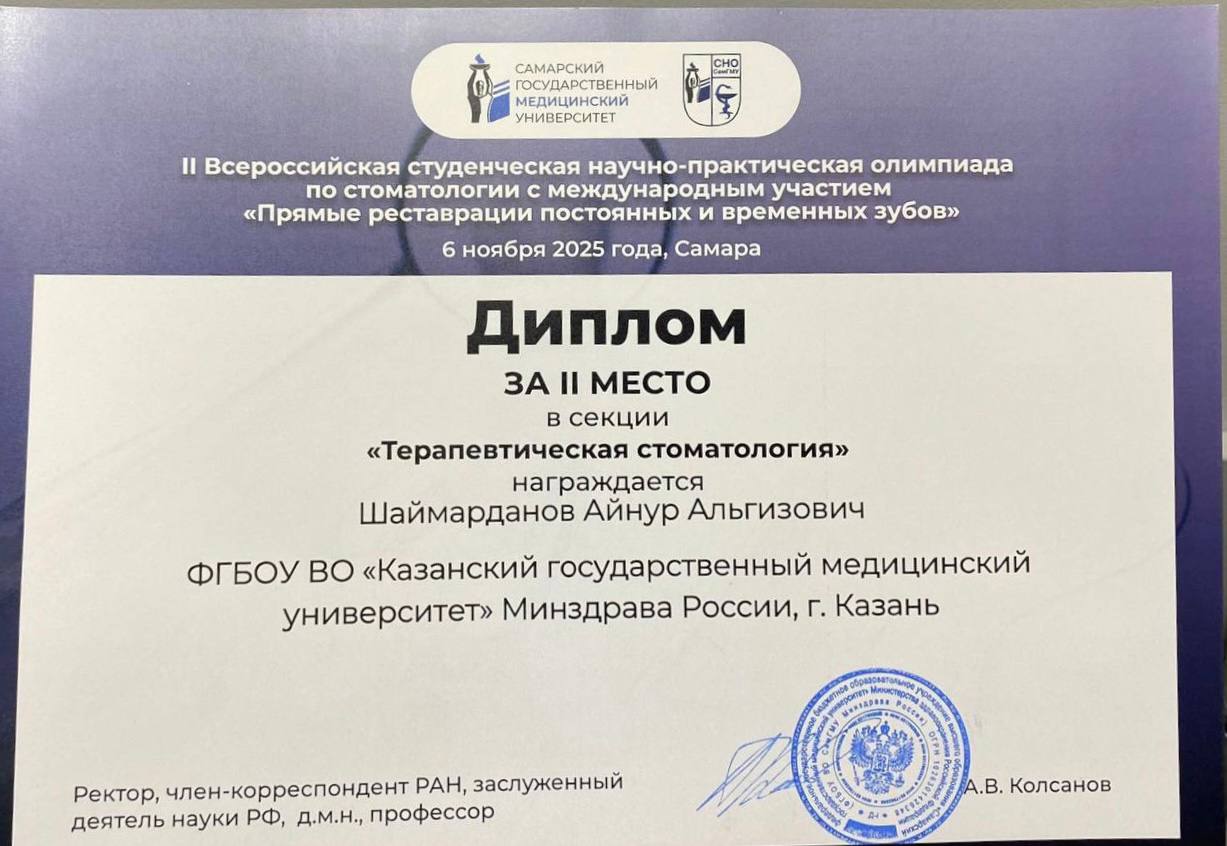 Кафедру терапевтической стоматологии Казанский ГМУ представил Шаймарданов Айнур - студент 5 курса, активный участник научного кружка (СНК) по терапевтической стоматологии. Айнур продемонстрировал высокий уровень знаний и практических навыков, заняв почетное 2-е место.